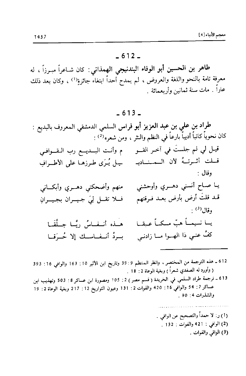 [613] ترجمة طراد السلمي في الخريدة (قسم مصر) 2: 105 ومصورة ابن عساكر 8: 503 وتهذيب ابن عساكر 7: 54 والوافي 16: 420 والفوات 2: 131 وعيون التواريخ 12: 217 وبغية الوعاة 2: 19 والشذرات 4: 90.
