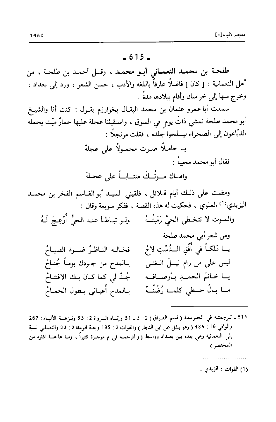 [615] ترجمته في الخريدة (قسم العراق) 2: 3- 51 وإنباه الرواة 2: 93 ونزهة الألباء: 267 والوافي 16: 486 (وهو ينقل عن ابن النجار) والفوات 2: 135 وبغية الوعاة 2: 20 والنعماني نسبة إلى النعمانية وهي بلدة بين بغداد وواسط (والترجمة في م موجزة كثيرا، وما ها هنا اكثره من المختصر) .