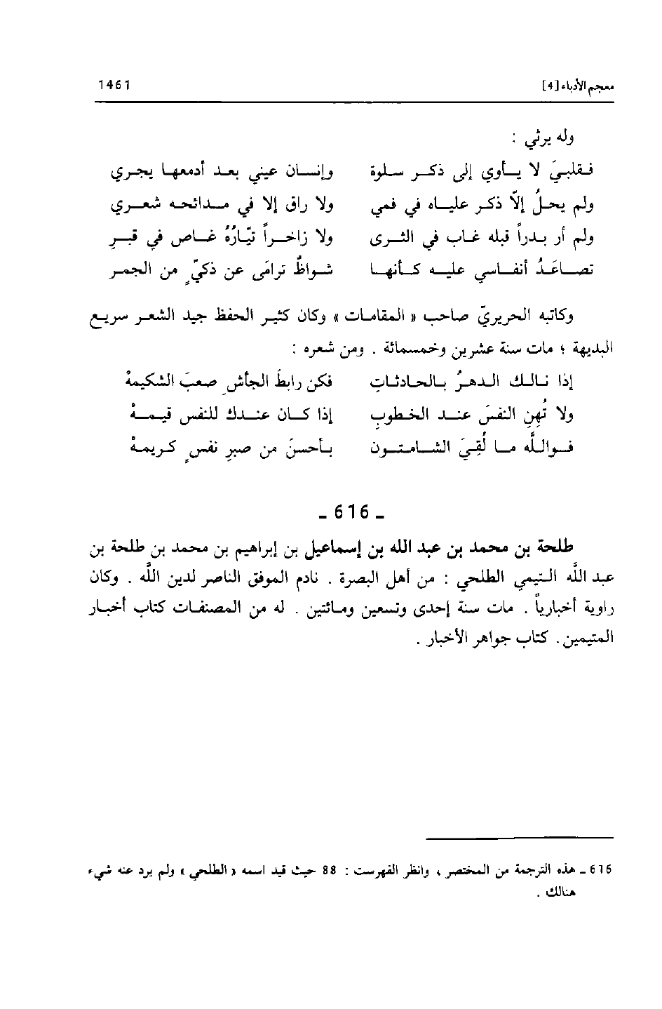 [616] هذه الترجمة من المختصر، وانظر الفهرست: 88 حيث قيد اسمه «الطلحي» ولم يرد عنه شيء هنالك.