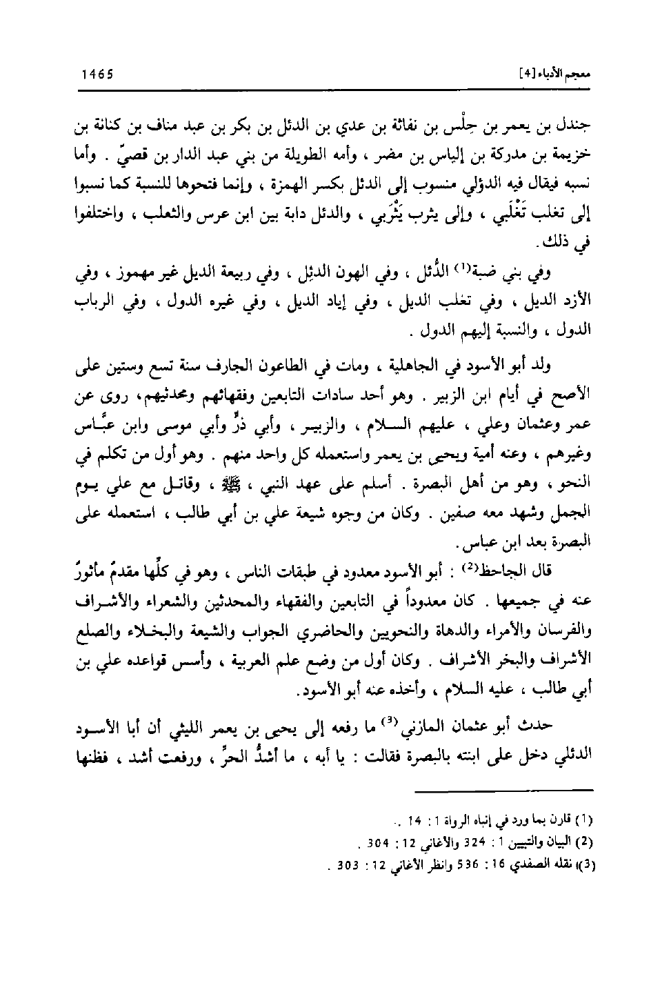 قال الجاحظ «2» : أبو الأسود معدود في طبقات الناس، وهو في كلّها مقدم مأثور عنه في جميعها. كان معدودا في التابعين والفقهاء والمحدثين والشعراء والأشراف والفرسان والأمراء والدهاة والنحويين والحاضري الجواب والشيعة والبخلاء والصلع الأشراف والبخر الأشراف. وكان أول من وضع علم العربية، وأسس قواعده علي بن أبي طالب، عليه السلام، وأخذه عنه أبو الأسود.