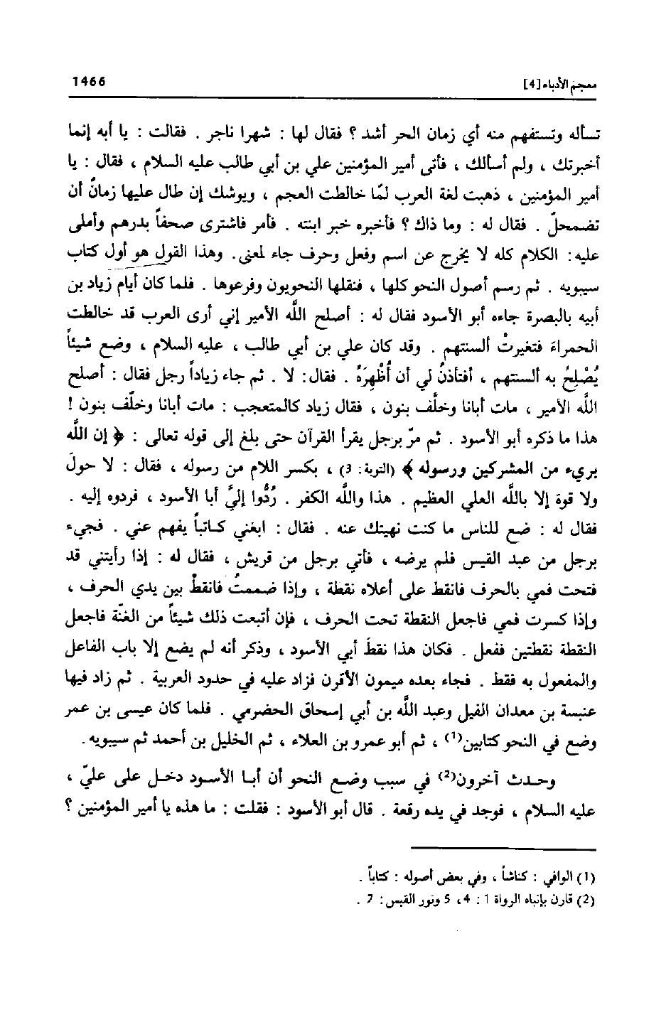 تسأله وتستفهم منه أي زمان الحر أشد؟ فقال لها: شهرا ناجر. فقالت: يا أبه إنما أخبرتك، ولم أسألك، فأتى أمير المؤمنين علي بن أبي طالب عليه السلام، فقال: يا أمير المؤمنين، ذهبت لغة العرب لمّا خالطت العجم، ويوشك إن طال عليها زمان أن تضمحلّ. فقال له: وما ذاك؟ فأخبره خبر ابنته. فأمر فاشترى صحفا بدرهم وأملى عليه: الكلام كله لا يخرج عن اسم وفعل وحرف جاء لمعنى. وهذا القول هو أول كتاب سيبويه. ثم رسم أصول النحو كلها، فنقلها النحويون وفرعوها. فلما كان أيام زياد بن أبيه بالبصرة جاءه أبو الأسود فقال له: أصلح الله الأمير إني أرى العرب قد خالطت الحمراء فتغيرت ألسنتهم. وقد كان علي بن أبي طالب، عليه السلام، وضع شيئا يصلح به ألسنتهم، أفتأذن لي أن أظهره. فقال: لا. ثم جاء زيادا رجل فقال: أصلح الله الأمير، مات أبانا وخلّف بنون، فقال زياد كالمتعجب: مات أبانا وخلّف بنون! هذا ما ذكره أبو الأسود. ثم مرّ برجل يقرأ القرآن حتى بلغ إلى قوله تعالى: أَنَّ اللَّهَ بَرِيءٌ مِنَ الْمُشْرِكِينَ وَرَسُولُهُ