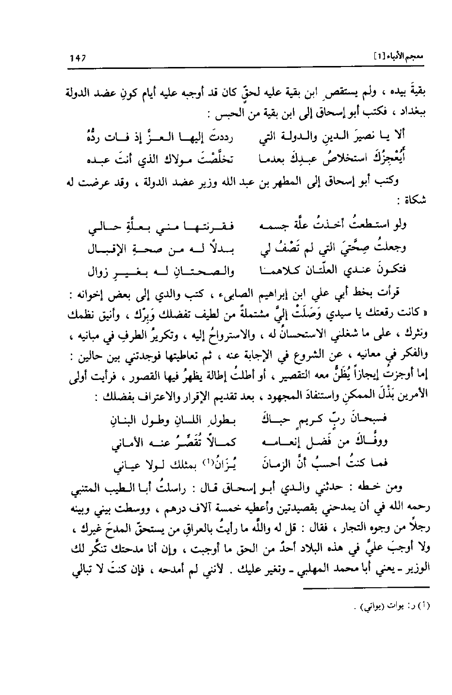 بقية بيده، ولم يستقص ابن بقية عليه لحقّ كان قد أوجبه عليه أيام كون عضد الدولة ببغداد، فكتب أبو إسحاق إلى ابن بقية من الحبس: