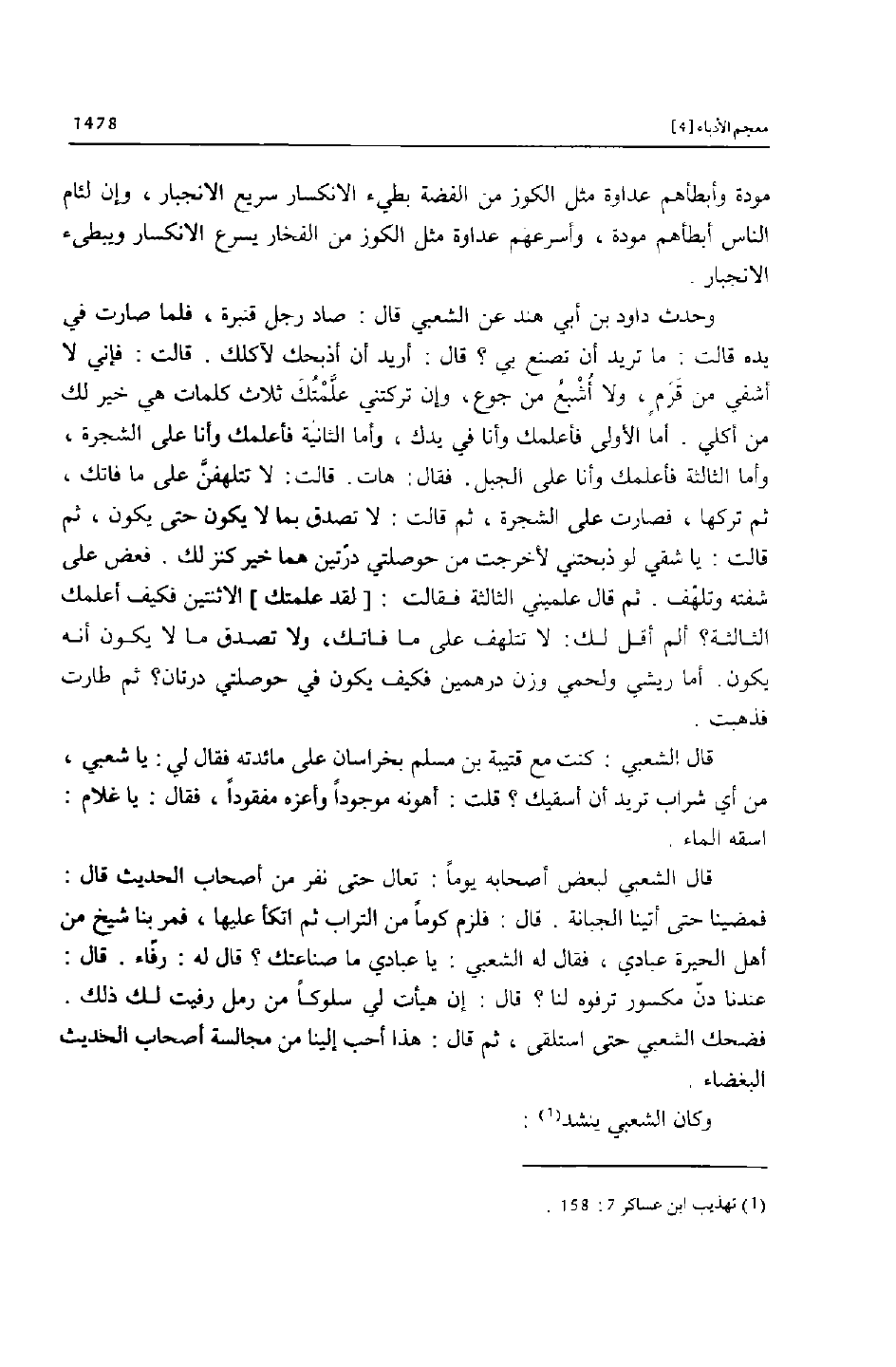 فمضينا حتى أتينا الجبانة. قال: فلزم كوما من التراب ثم اتكأ عليها، فمر بنا شيخ من أهل الحيرة عبادي، فقال له الشعبي: يا عبادي ما صناعتك؟ قال له: رفّاء. قال: