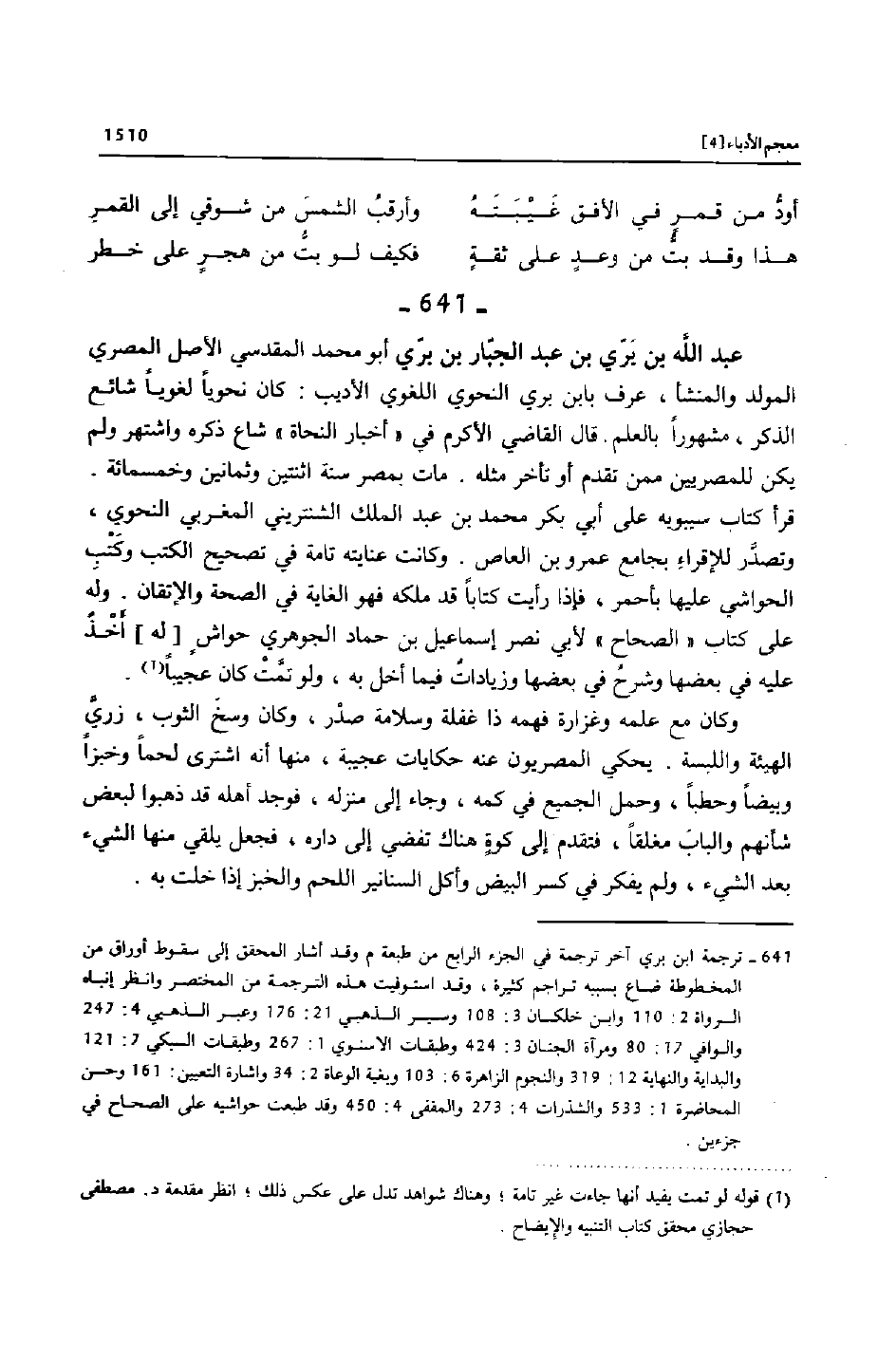 [641]- ترجمة ابن بري آخر ترجمة في الجزء الرابع من طبعة م وقد أشار المحقق إلى سقوط أوراق من المخطوطة ضاع بسببه تراجم كثيرة، وقد استوفيت هذه الترجمة من المختصر وانظر إنباه الرواة 2: 110 وابن خلكان 3: 108 وسير الذهبي 21: 176 وعبر الذهبي 4: 247 والوافي 17: 80 ومرآة الجنان 3: 424 وطبقات الاسنوي 1: 267 وطبقات السبكي 7: 121 والبداية والنهاية 12: 319 والنجوم الزاهرة 6: 103 وبغية الوعاة 2: 34 واشارة التعيين: 161 وحسن المحاضرة 1: 533 والشذرات 4: 273 والمقفى 4: 450 وقد طبعت حواشيه على الصحاح في جزءين.