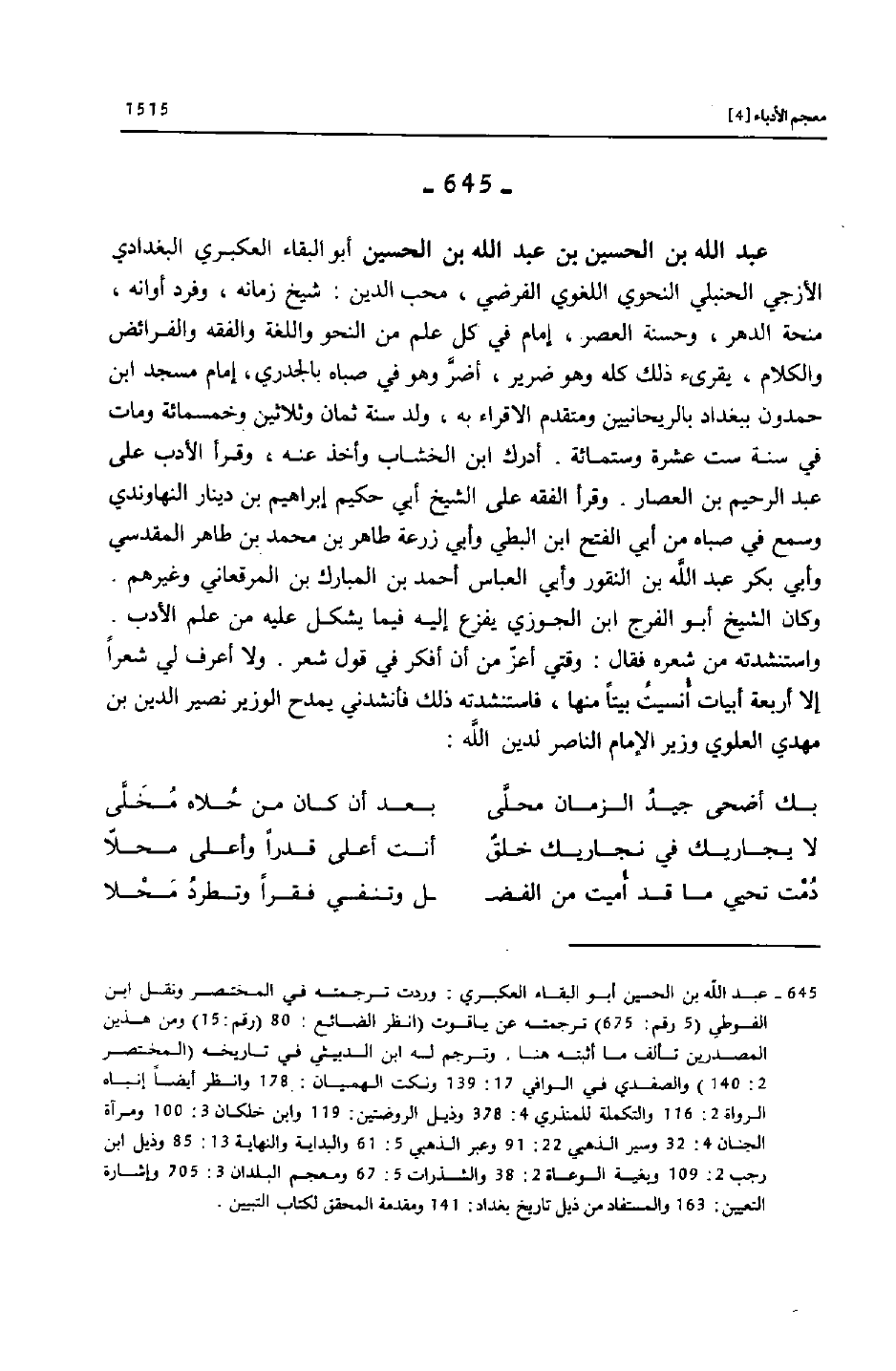 [645]- عبد الله بن الحسين أبو البقاء العكبري: وردت ترجمته في المختصر ونقل ابن الفوطي (5 رقم: 675) ترجمته عن ياقوت (انظر الضائع: 80 (رقم: 15) ومن هذين المصدرين تألف ما أثبته هنا. وترجم له ابن الدبيثي في تاريخه (المختصر 2: 140) والصفدي في الوافي 17: 139 ونكت الهميان: 178 وانظر أيضا إنباه الرواة 2: 116 والتكملة للمنذري 4: 378 وذيل الروضتين: 119 وابن خلكان 3: 100 ومرآة الجنان 4: 32 وسير الذهبي 22: 91 وعبر الذهبي 5: 61 والبداية والنهاية 13: 85 وذيل ابن رجب 2: 109 وبغية الوعاة 2: 38 والشذرات 5: 67 ومعجم البلدان 3: 705 وإشارة التعيين: 163 والمستفاد من ذيل تاريخ بغداد: 141 ومقدمة المحقق لكتاب التبيين.