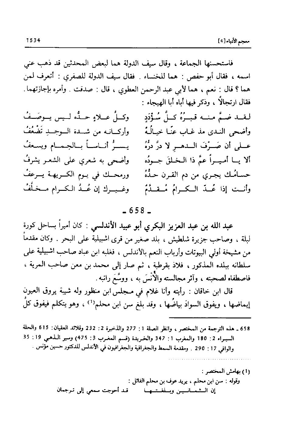 [658]- هذه الترجمة من المختصر، وانظر الصلة 1: 277 والذخيرة 2: 232 وقلائد العقيان: 615 والحلة السيراء 2: 180 والمغرب 1: 347 والخريدة (قسم المغرب 3: 475) وسير الذهبي 19: 35 والوافي 17: 290. ومقدمة السمط والجغرافية والجغرافيون في الأندلس للدكتور حسين مؤنس.
