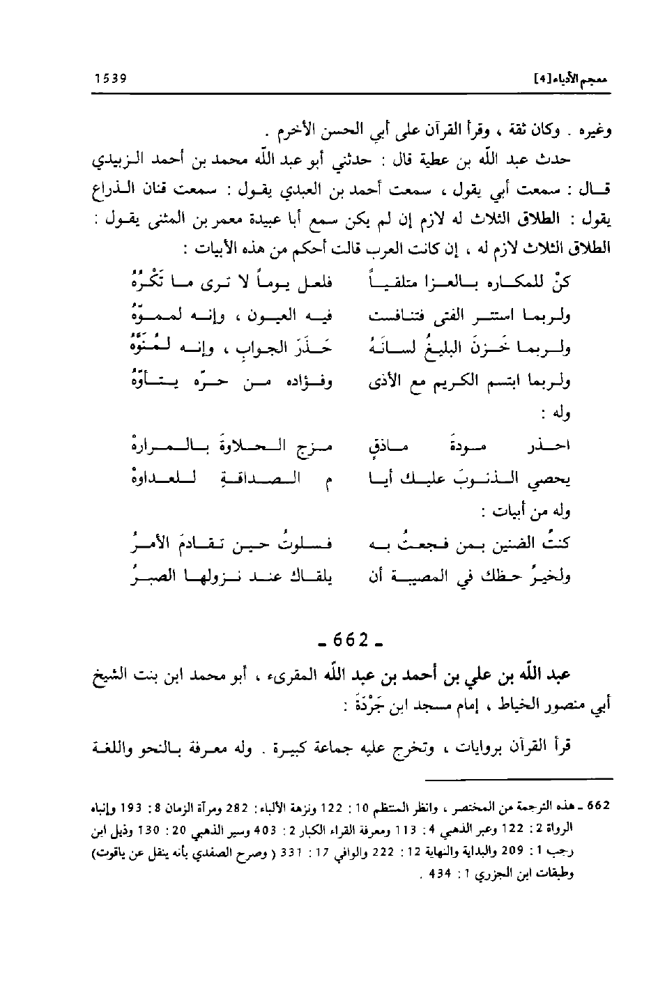 [662]- هذه الترجمة من المختصر، وانظر المنتظم 10: 122 ونزهة الألباء: 282 ومرآة الزمان 8: 193 وإنباه الرواة 2: 122 وعبر الذهبي 4: 113 ومعرفة القراء الكبار 2: 403 وسير الذهبي 20: 130 وذيل ابن رجب 1: 209 والبداية والنهاية 12: 222 والوافي 17: 331 (وصرح الصفدي بأنه ينقل عن ياقوت) وطبقات ابن الجزري 1: 434.