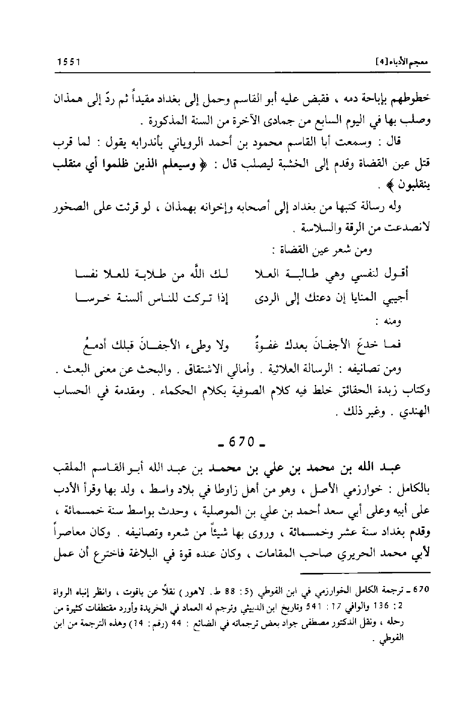 [670]- ترجمة الكامل الخوارزمي في ابن الفوطي (5: 88 ط. لاهور) نقلا عن ياقوت، وانظر إنباه الرواة 2: 136 والوافي 17: 541 وتاريخ ابن الدبيثي وترجم له العماد في الخريدة وأورد مقتطفات كثيرة من رحله، ونقل الدكتور مصطفى جواد بعض ترجماته في الضائع: 44 (رقم: 14) وهذه الترجمة من ابن الفوطي.