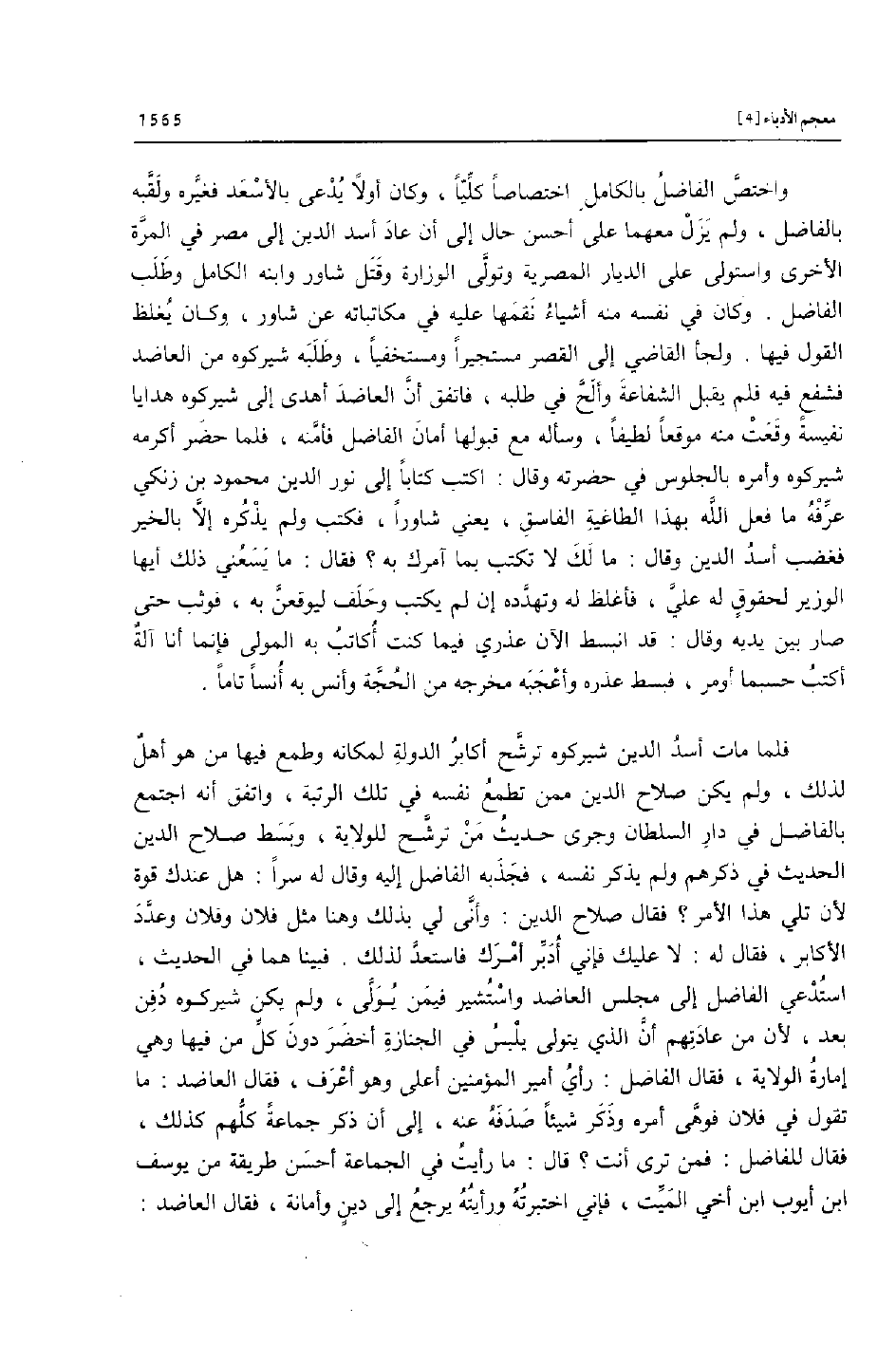 واختصّ الفاضل بالكامل اختصاصا كلّيّا، وكان أولا يدعى بالأسعد فغيّره ولقّبه بالفاضل، ولم يزل معهما على أحسن حال إلى أن عاد أسد الدين إلى مصر في المرّة الأخرى واستولى على الديار المصرية وتولّى الوزارة وقتل شاور وابنه الكامل وطلب الفاضل. وكان في نفسه منه أشياء نقمها عليه في مكاتباته عن شاور، وكان يغلظ القول فيها. ولجأ القاضي إلى القصر مستجيرا ومستخفيا، وطلبه شيركوه من العاضد فشفع فيه فلم يقبل الشفاعة وألحّ في طلبه، فاتفق أنّ العاضد أهدى إلى شيركوه هدايا نفيسة وقعت منه موقعا لطيفا، وسأله مع قبولها أمان الفاضل فأمّنه، فلما حضر أكرمه شيركوه وأمره بالجلوس في حضرته وقال: اكتب كتابا إلى نور الدين محمود بن زنكي عرّفه ما فعل الله بهذا الطاغية الفاسق، يعني شاورا، فكتب ولم يذكره إلّا بالخير فغضب أسد الدين وقال: ما لك لا تكتب بما آمرك به؟ فقال: ما يسعني ذلك أيها الوزير لحقوق له عليّ، فأغلظ له وتهدّده إن لم يكتب وحلف ليوقعنّ به، فوثب حتى صار بين يديه وقال: قد انبسط الآن عذري فيما كنت أكاتب به المولى فإنما أنا آلة أكتب حسبما أومر، فبسط عذره وأعجبه مخرجه من الحجّة وأنس به أنسا تاما.