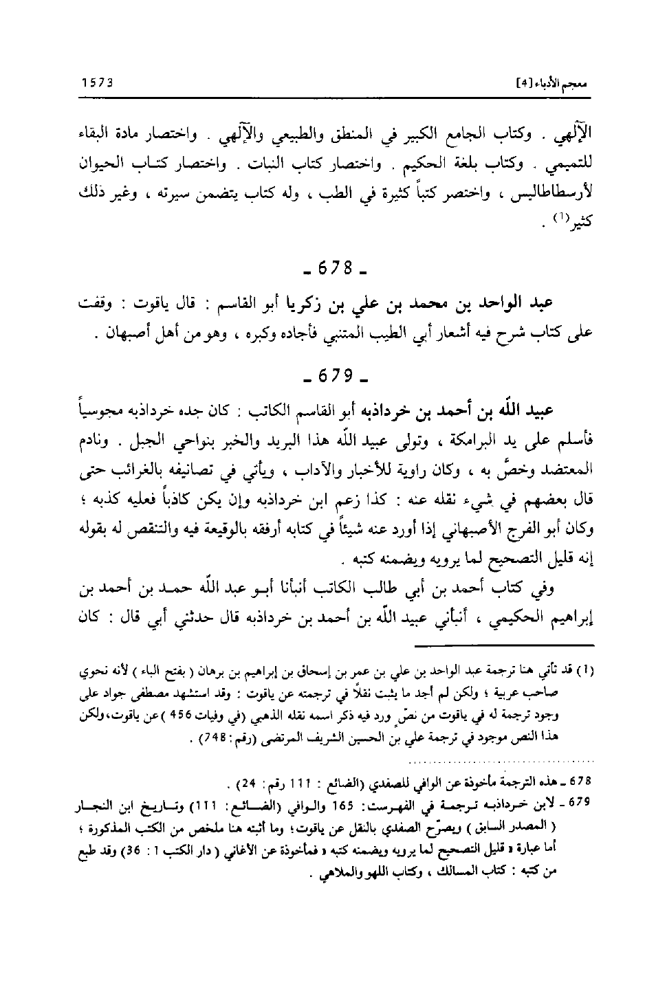 [679]- لابن خرداذبه ترجمة في الفهرست: 165 والوافي (الضائع: 111) وتاريخ ابن النجار (المصدر السابق) ويصرّح الصفدي بالنقل عن ياقوت؛ وما أثبته هنا ملخص من الكتب المذكورة؛ أما عبارة «قليل التصحيح لما يرويه ويضمنه كتبه «فمأخوذة عن الأغاني (دار الكتب 1: 36) وقد طبع من كتبه: كتاب المسالك، وكتاب اللهو والملاهي.