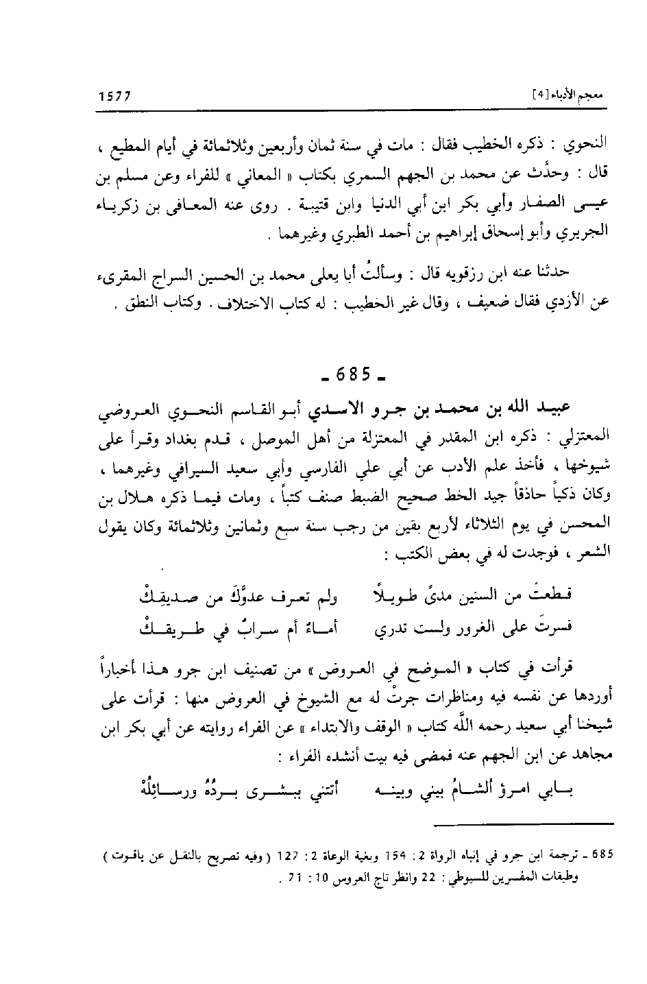 [685]- ترجمة ابن جرو في إنباه الرواة 2: 154 وبغية الوعاة 2: 127 (وفيه تصريح بالنقل عن ياقوت) وطبقات المفسرين للسيوطي: 22 وانظر تاج العروس 10: 71.