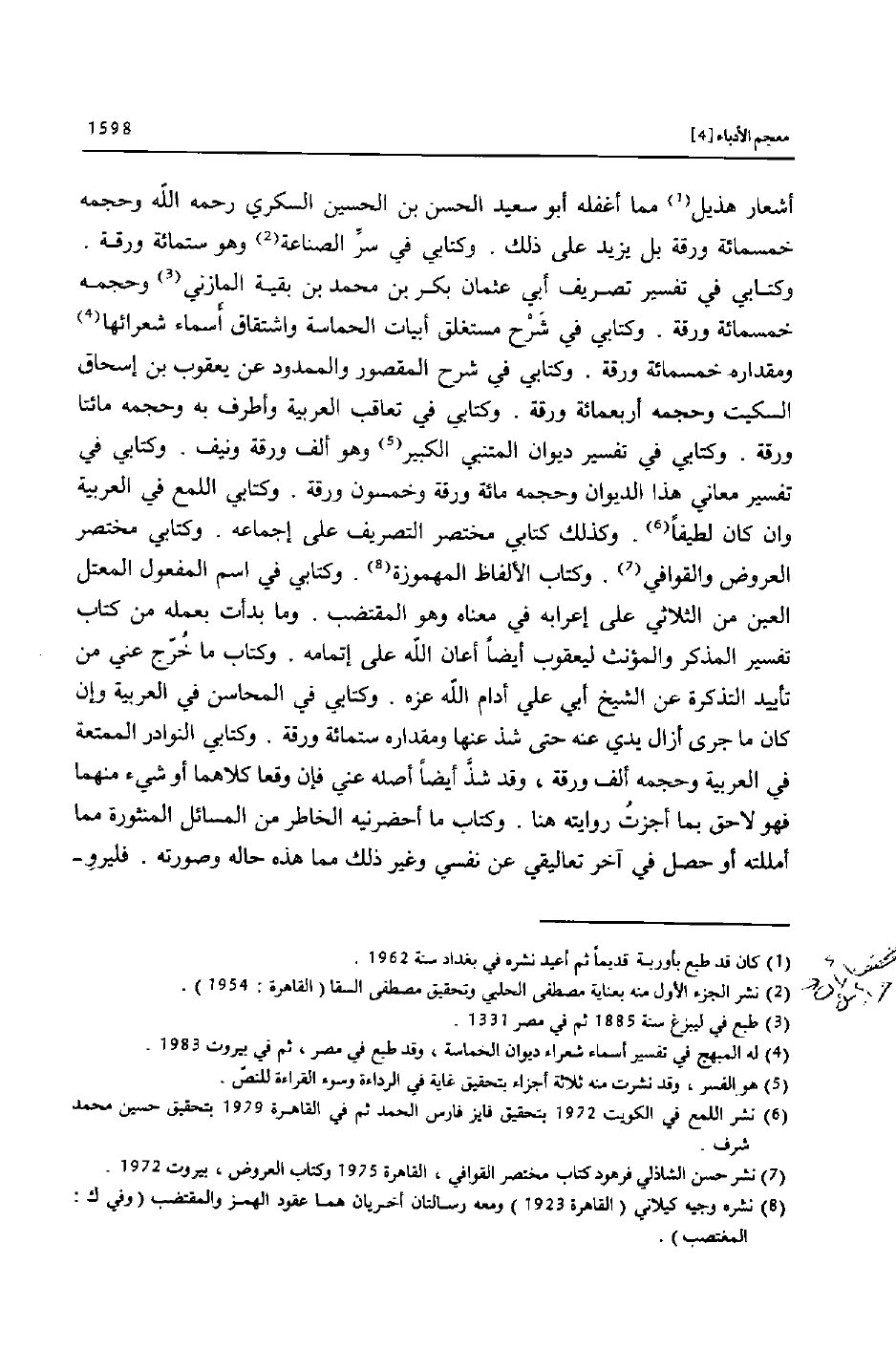 أشعار هذيل «1» مما أغفله أبو سعيد الحسن بن الحسين السكري رحمه الله وحجمه خمسمائة ورقة بل يزيد على ذلك. وكتابي في سرّ الصناعة «2» وهو ستمائة ورقة.
