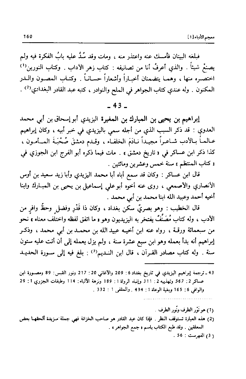 [43]- ترجمة إبراهيم اليزيدي في تاريخ بغداد 6: 209 والأغاني 20: 217 ونور القبس: 89 ومصورة ابن عساكر 2: 567 وتهذيبه 2: 311 وإنباه الرواة 1: 189 ونزهة الألباء: 114 وطبقات الجزري 1: 29 والوافي 6: 165 وبغية الوعاة 1: 434. والمقفى 1: 332.