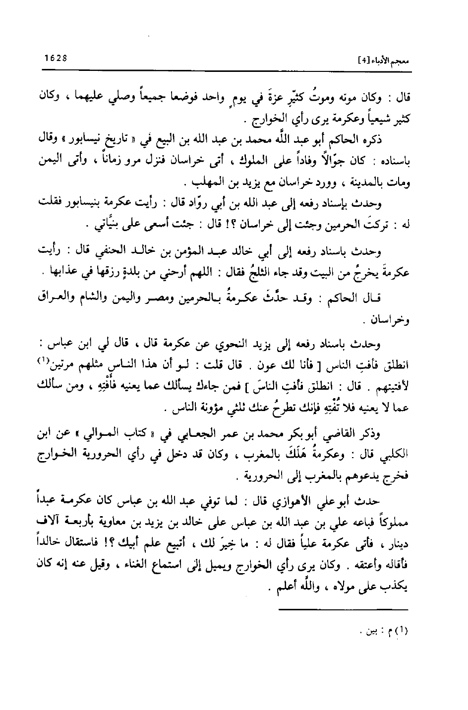 وذكر القاضي أبو بكر محمد بن عمر الجعابي في «كتاب الموالي» عن ابن الكلبي قال: وعكرمة هلك بالمغرب، وكان قد دخل في رأي الحرورية الخوارج فخرج يدعوهم بالمغرب إلى الحرورية.