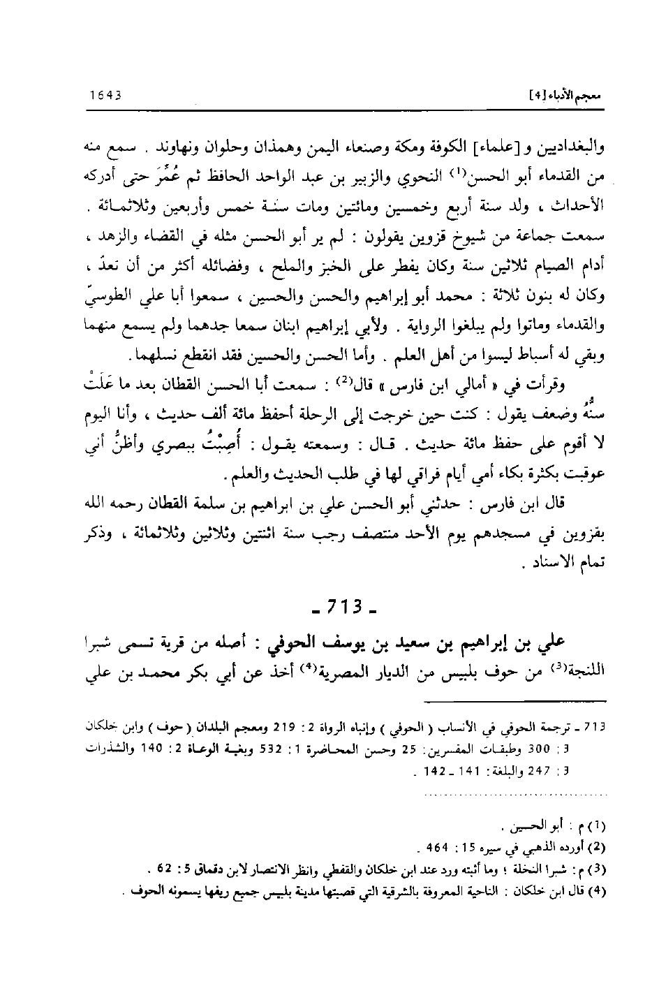 [713]- ترجمة الحوفي في الأنساب (الحوفي) وإنباه الرواة 2: 219 ومعجم البلدان (حوف) وابن خلكان 3: 300 وطبقات المفسرين: 25 وحسن المحاضرة 1: 532 وبغية الوعاة 2: 140 والشذرات 3: 247 والبلغة: 141- 142.