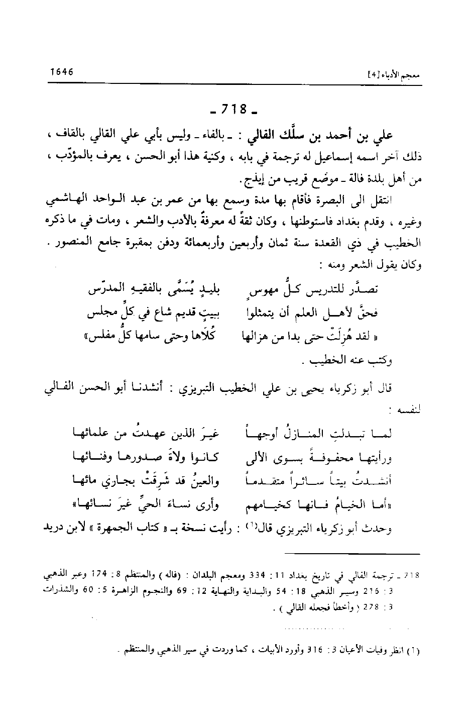 [718] ترجمة الفالي في تاريخ بغداد 11: 334 ومعجم البلدان: (فاله) والمنتظم 8: 174 وعبر الذهبي 3: 216 وسير الذهبي 18: 54 والبداية والنهاية 12: 69 والنجوم الزاهرة 5: 60 والشذرات 3: 278 (وأخطأ فجعله القالي) .