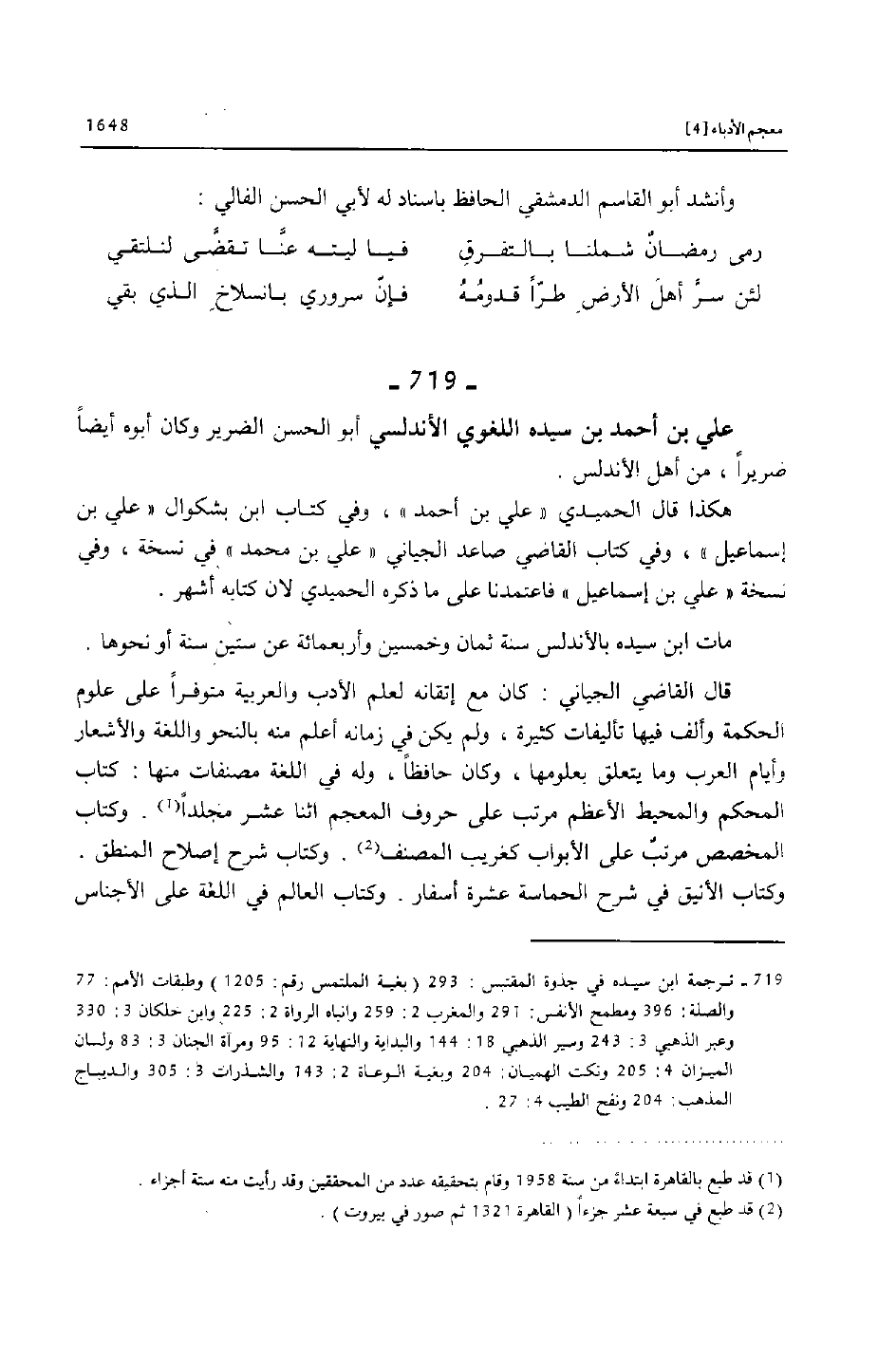[719]- ترجمة ابن سيده في جذوة المقتبس: 293 (بغية الملتمس رقم: 1205) وطبقات الأمم: 77 والصلة: 396 ومطمح الأنفس: 291 والمغرب 2: 259 وانباه الرواة 2: 225 وابن خلكان 3: 330 وعبر الذهبي 3: 243 وسير الذهبي 18: 144 والبداية والنهاية 12: 95 ومرآة الجنان 3: 83 ولسان الميزان 4: 205 ونكت الهميان: 204 وبغية الوعاة 2: 143 والشذرات 3: 305 والديباج المذهب: 204 ونفح الطيب 4: 27.