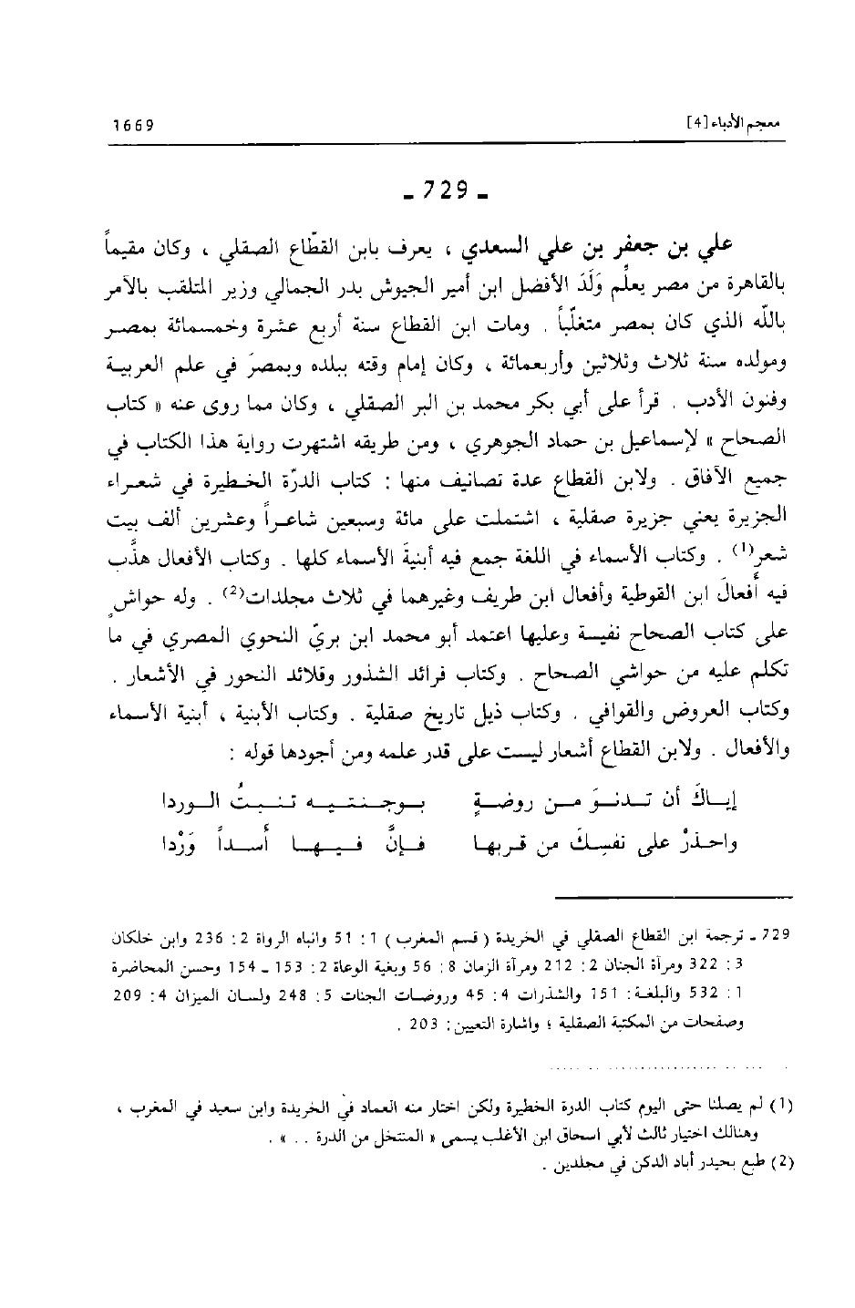 [729] ترجمة ابن القطاع الصقلي في الخريدة (قسم المغرب) 1: 51 وانباه الرواة 2: 236 وابن خلكان 3: 322 ومرآة الجنان 2: 212 ومرآة الزمان 8: 56 وبغية الوعاة 2: 153- 154 وحسن المحاضرة 1: 532 والبلغة: 151 والشذرات 4: 45 وروضات الجنات 5: 248 ولسان الميزان 4: 209 وصفحات من المكتبة الصقلية؛ واشارة التعيين: 203.