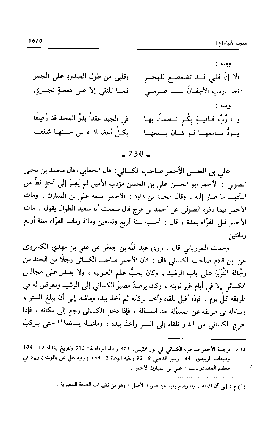 [730]- ترجمة الأحمر صاحب الكسائي في نور القبس: 301 وانباه الرواة 2: 313 وتاريخ بغداد 12: 104 وطبقات الزبيدي: 134 وسير الذهبي 9: 92 وبغية الوعاة 2: 158 (وفيه نقل عن ياقوت) ويرد في معظم المصادر باسم: علي بن المبارك الأحمر.