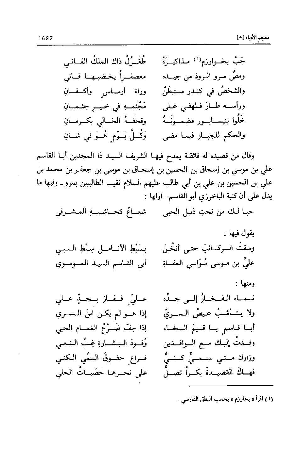 وقال من قصيدة له فائقة يمدح فيها الشريف السيد ذا المجدين أبا القاسم علي بن موسى بن إسحاق بن الحسين بن إسحاق بن موسى بن جعفر بن محمد بن علي بن الحسين بن علي بن أبي طالب عليهم السلام نقيب الطالبيين بمرو- وفيها ما يدل على أن كنية الباخرزي أبو القاسم- أولها: