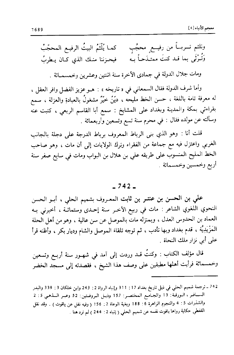 [742]- ترجمة شميم الحلي في ذيل تاريخ بغداد 17: 311 وإنباه الرواة 2: 243 وابن خلكان 3: 339 والبدر السافر، الورقة: 13 والجامع المختصر: 157 وذيل الروضتين: 52 وعبر الذهبي 5: 2 والشذرات 5: 4 والنجوم الزاهرة 6: 188 وبغية الوعاة 2: 156 (وفيه نقل عن ياقوت) . وقد نقل القفطي حكاية رواها ياقوت نفسه عن شميم الحلي (إنباه 2: 244) لم ترد هنا.