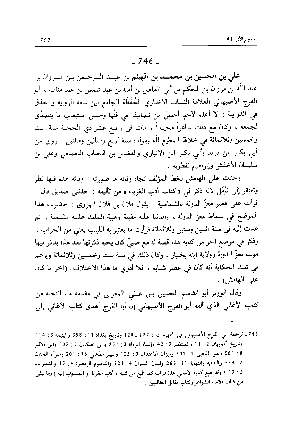 [746]- ترجمة أبي الفرج الأصبهاني في الفهرست: 127- 128 وتاريخ بغداد 11: 398 واليتيمة 3: 114 وتاريخ أصبهان 2: 11 والمنتظم 7: 40 وإنباه الرواة 2: 251 وابن خلكان 3: 307 وابن الأثير 8: 581 وعبر الذهبي 2: 305 وميزان الاعتدال 3: 123 وسير الذهبي 16: 201 ومرآة الجنان 2: 359 والبداية والنهاية 11: 263 ولسان الميزان 4: 221 والنجوم الزاهرة 4: 15 والشذرات 3: 19؛ وقد طبع كتابه الأغاني عدة مرات كما طبع من كتبه، أدب الغرباء (المنسوب إليه) وما تبقى من كتاب الاماء الشواعر وكتاب مقاتل الطالبيين.