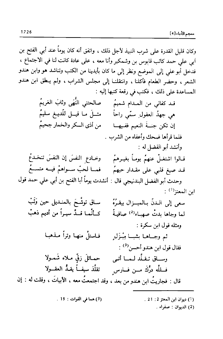 قال: فجاريت ابن هندو من بعد، وقد اجتمعت معه، الأبيات، وقلت له: إن