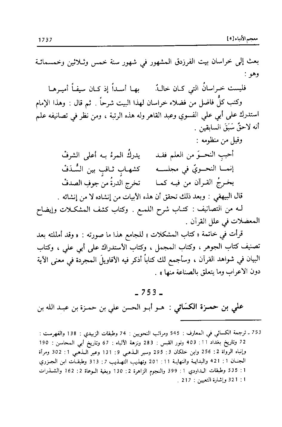 [753]- ترجمة الكسائي في المعارف: 545 ومراتب النحويين: 74 وطبقات الزبيدي: 138 والفهرست: