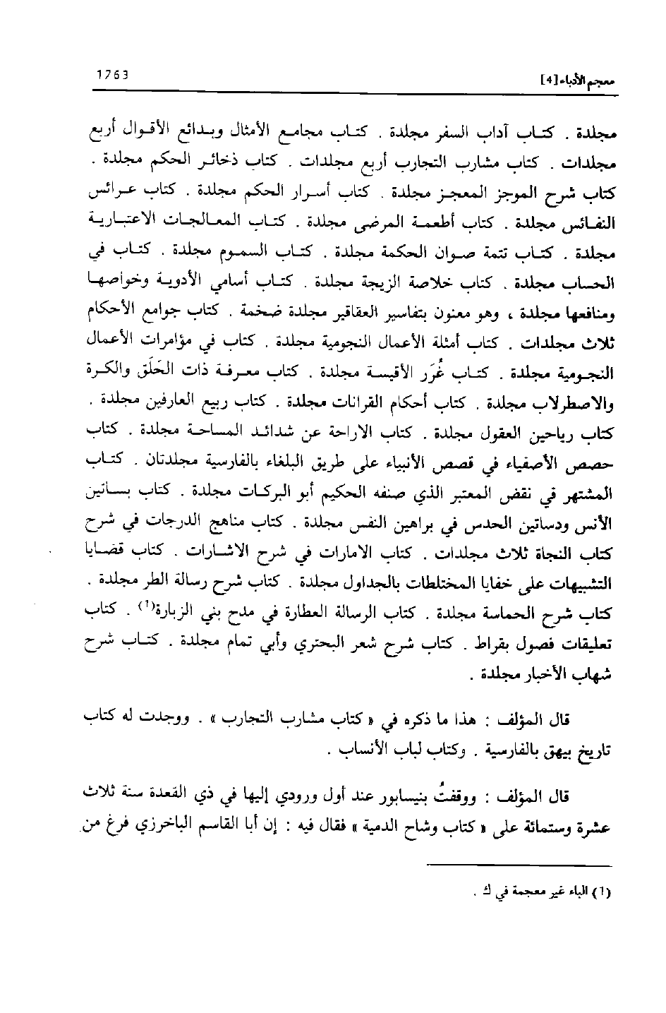 قال المؤلف: هذا ما ذكره في «كتاب مشارب التجارب» . ووجدت له كتاب تاريخ بيهق بالفارسية. وكتاب لباب الأنساب.