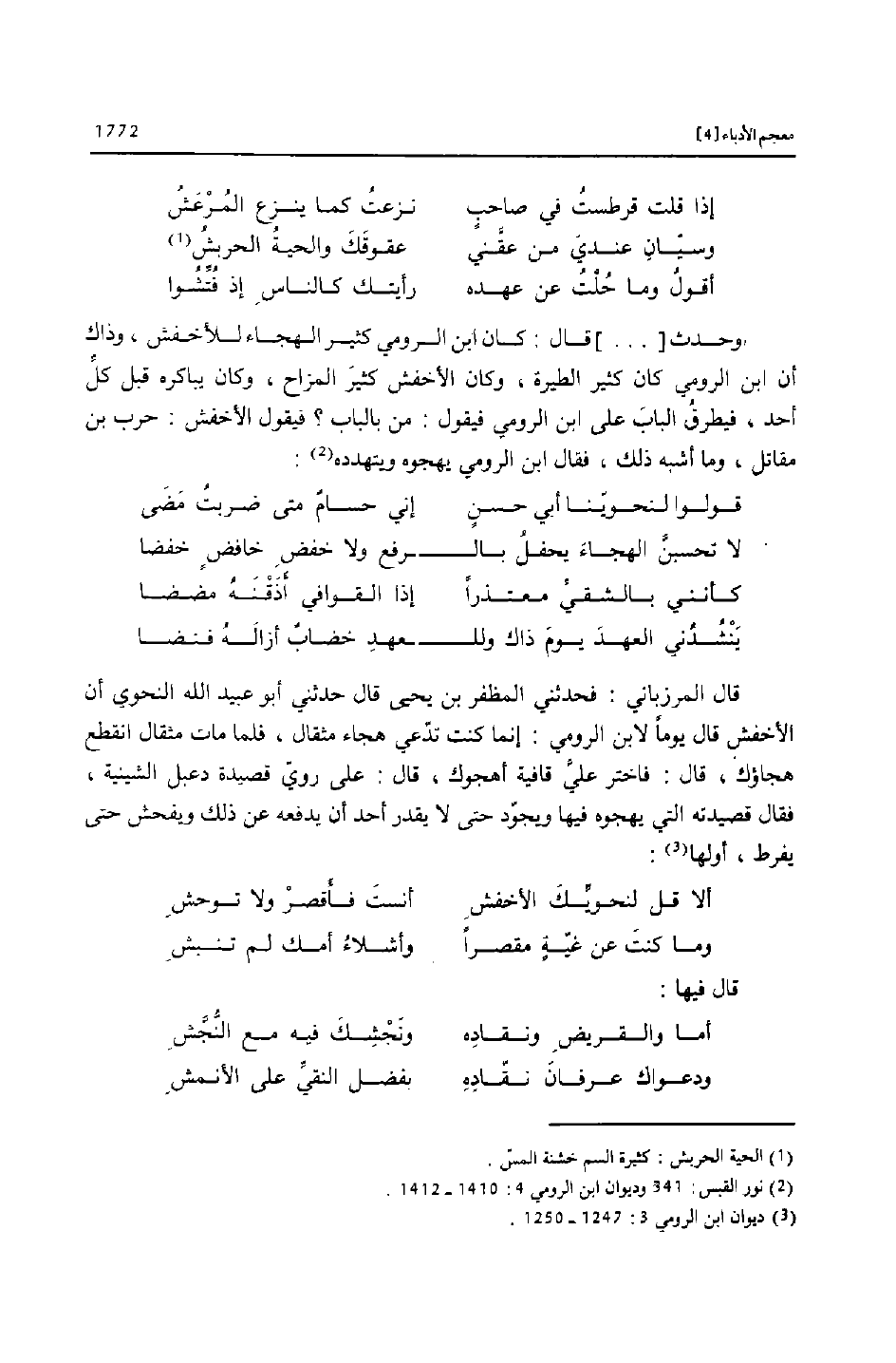 وحدث [ ... ] قال: كان ابن الرومي كثير الهجاء للأخفش، وذاك أن ابن الرومي كان كثير الطيرة، وكان الأخفش كثير المزاح، وكان يباكره قبل كلّ أحد، فيطرق الباب على ابن الرومي فيقول: من بالباب؟ فيقول الأخفش: حرب بن مقاتل، وما أشبه ذلك، فقال ابن الرومي يهجوه ويتهدده «2» :