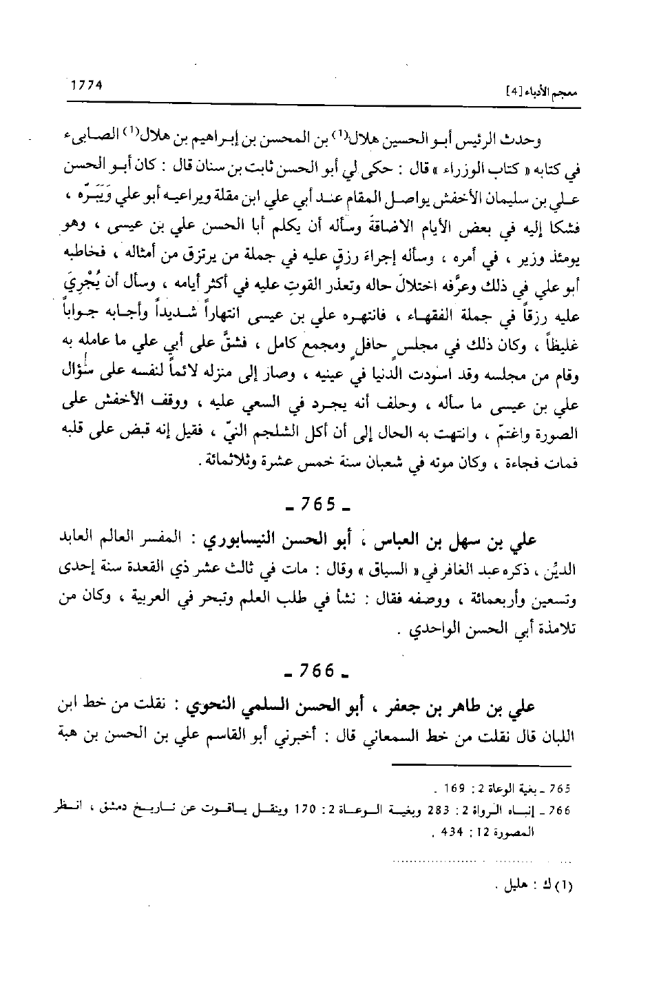 [766]- إنباه الرواة 2: 283 وبغية الوعاة 2: 170 وينقل ياقوت عن تاريخ دمشق، انظر المصورة 12: 434.