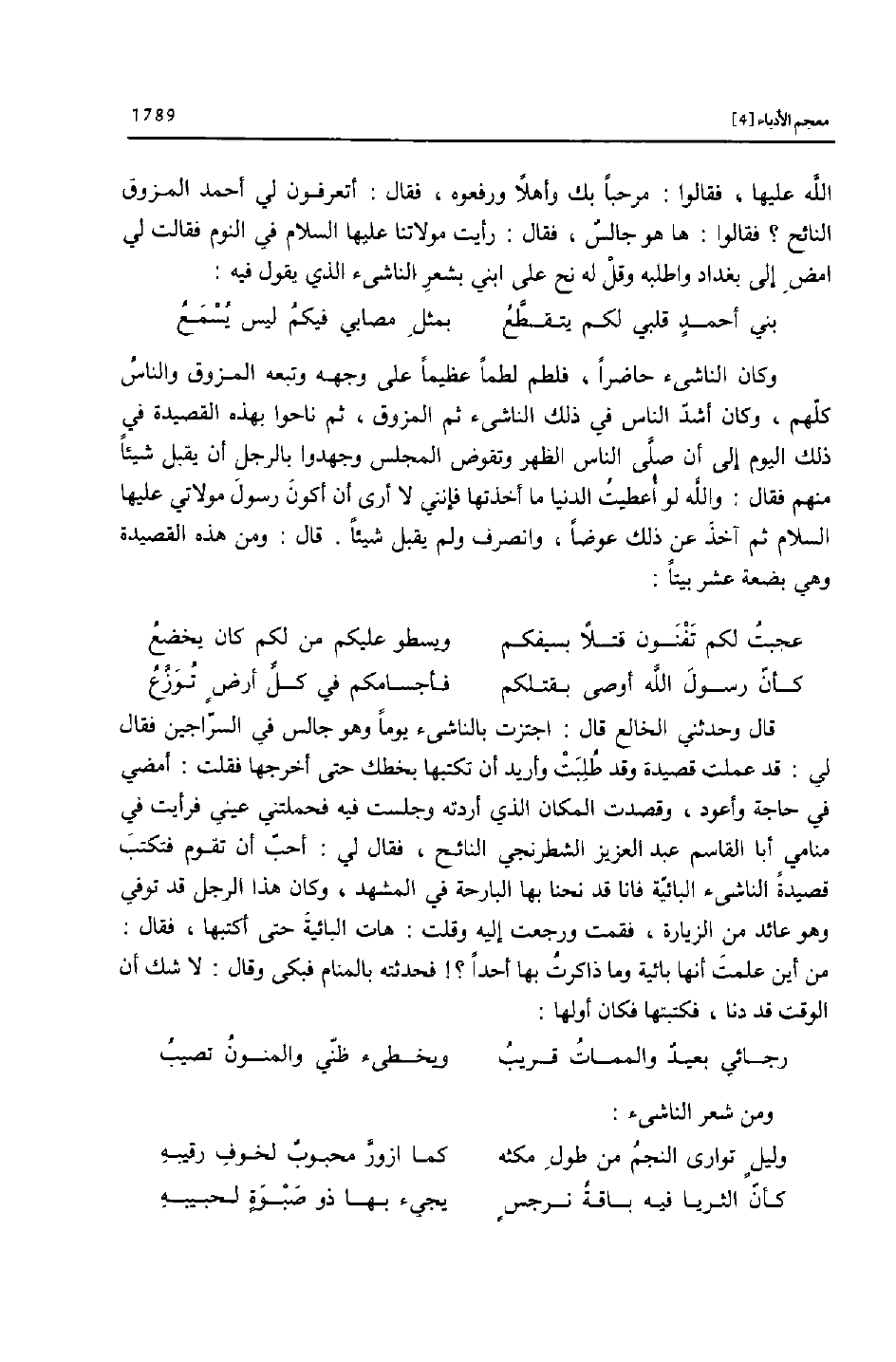 قال وحدثني الخالع قال: اجتزت بالناشىء يوما وهو جالس في السرّاجين فقال لي: قد عملت قصيدة وقد طلبت وأريد أن تكتبها بخطك حتى أخرجها فقلت: أمضي في حاجة وأعود، وقصدت المكان الذي أردته وجلست فيه فحملتني عيني فرأيت في منامي أبا القاسم عبد العزيز الشطرنجي النائح، فقال لي: أحبّ أن تقوم فتكتب قصيدة الناشىء البائيّة فانا قد نحنا بها البارحة في المشهد، وكان هذا الرجل قد توفي وهو عائد من الزيارة، فقمت ورجعت إليه وقلت: هات البائية حتى أكتبها، فقال: