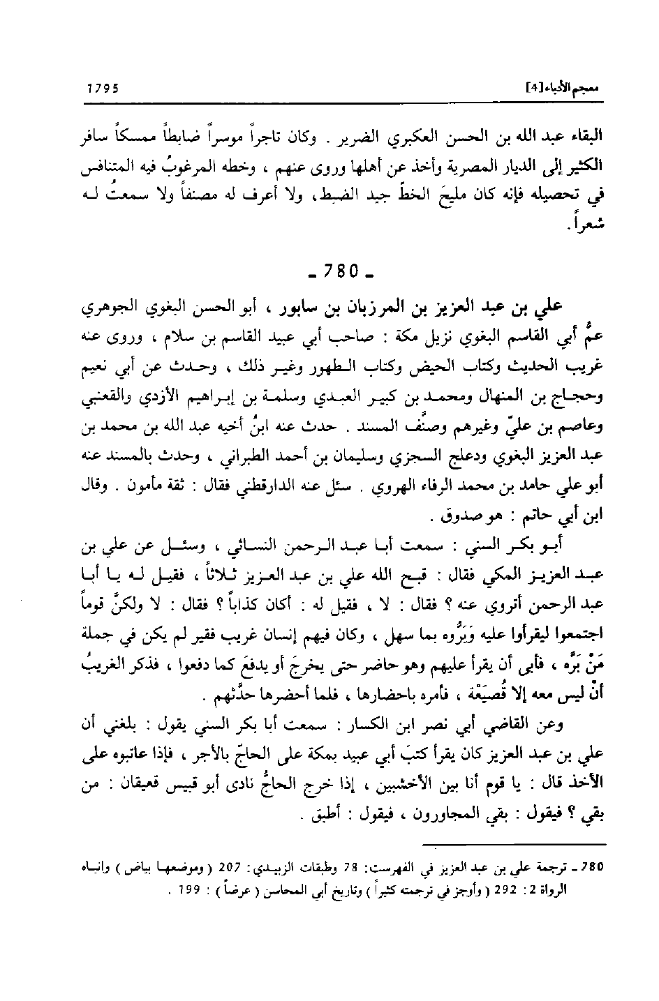 [780]- ترجمة علي بن عبد العزيز في الفهرست: 78 وطبقات الزبيدي: 207 (وموضعها بياض) وانباه الرواة 2: 292 (وأوجز في ترجمته كثيرا) وتاريخ أبي المحاسن (عرضا) : 199.