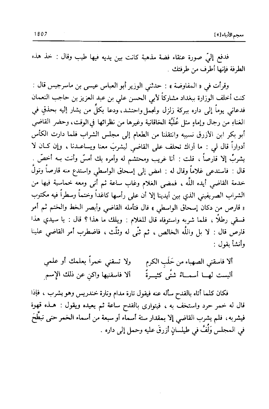 كنت أخلف الوزارة ببغداد مشاركا لأبي الحسن علي بن عبد العزيز بن حاجب النعمان فدعاني يوما إلى داره ببركة زلزل وتجمل واحتشد، ودعا بكلّ من يشار إليه بحذق في الغناء من رجال وإماء مثل عليّة الخاقانية وغيرها من نظرائها في الوقت، وحضر القاضي أبو بكر ابن الأزرق نسيبه وانتقلنا من الطعام إلى مجلس الشراب فلما دارت الكأس أدوارا قال لي: ما أراك تحلف على القاضي ليشرب معنا ويساعدنا، وإن كان لا يشرب إلا قارصا، قلت: أنا غريب ومحتشم له وأمره بك أمسّ وأنت به أخصّ.