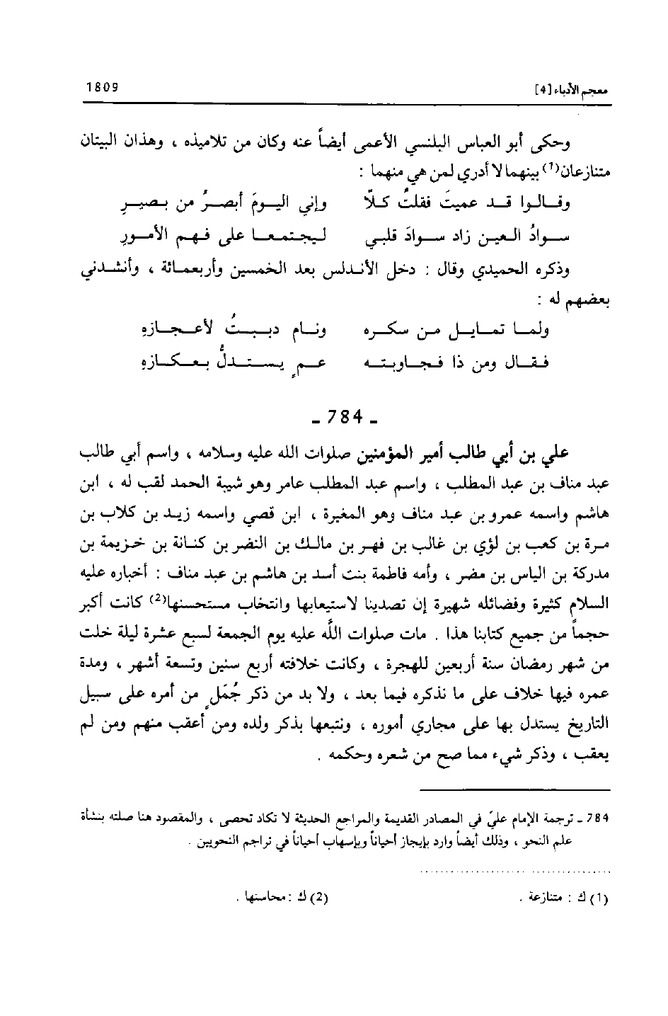 [784]- ترجمة الإمام عليّ في المصادر القديمة والمراجع الحديثة لا تكاد تحصى، والمقصود هنا صلته بنشأة علم النحو، وذلك أيضا وارد بإيجاز أحيانا وبإسهاب أحيانا في تراجم النحويين.