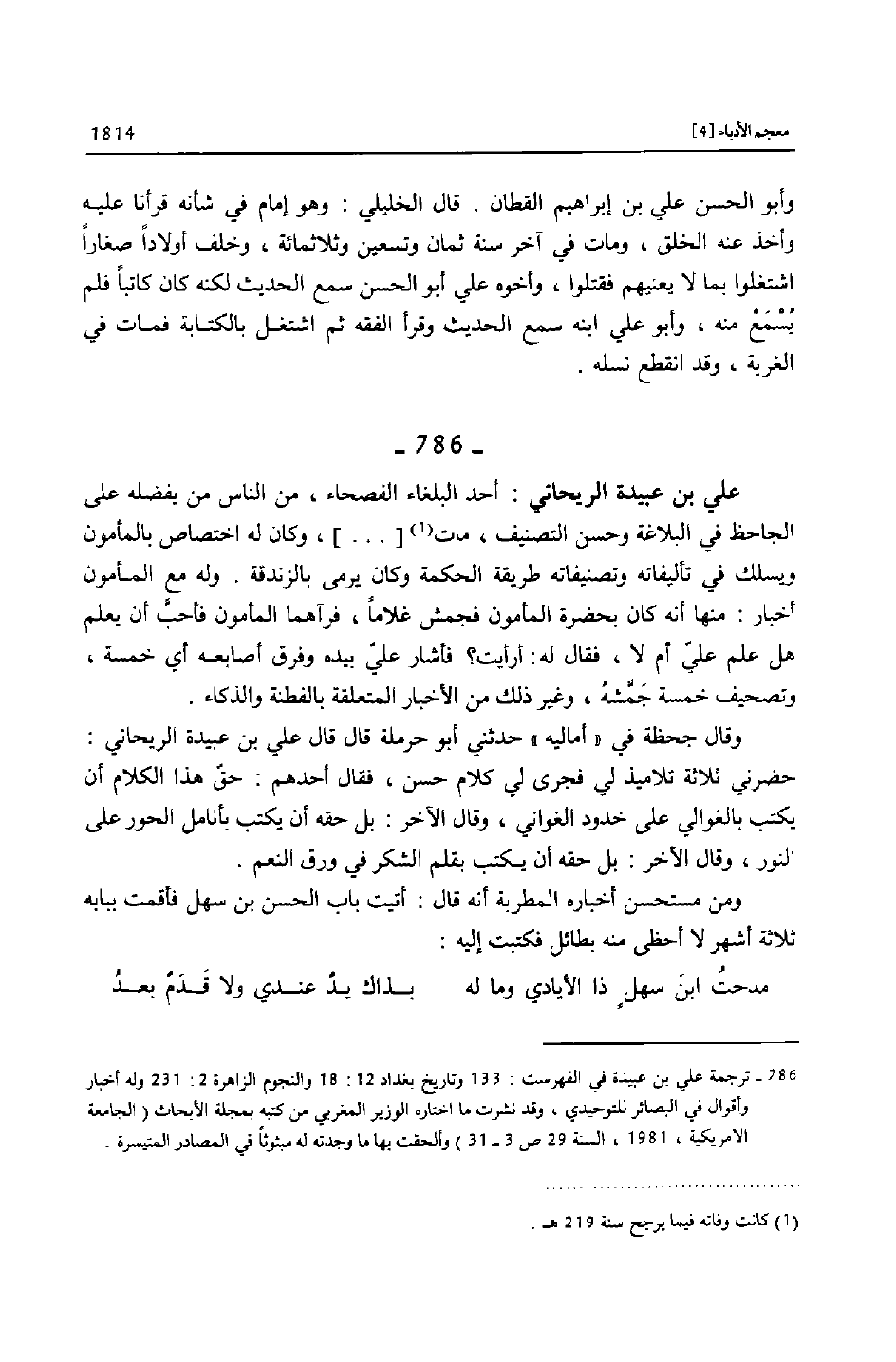 [786]- ترجمة علي بن عبيدة في الفهرست: 133 وتاريخ بغداد 12: 18 والنجوم الزاهرة 2: 231 وله أخبار وأقوال في البصائر للتوحيدي، وقد نشرت ما اختاره الوزير المغربي من كتبه بمجلة الأبحاث (الجامعة الامريكية، 1981، السنة 29 ص 3- 31) وألحقت بها ما وجدته له مبثوثا في المصادر المتيسرة.