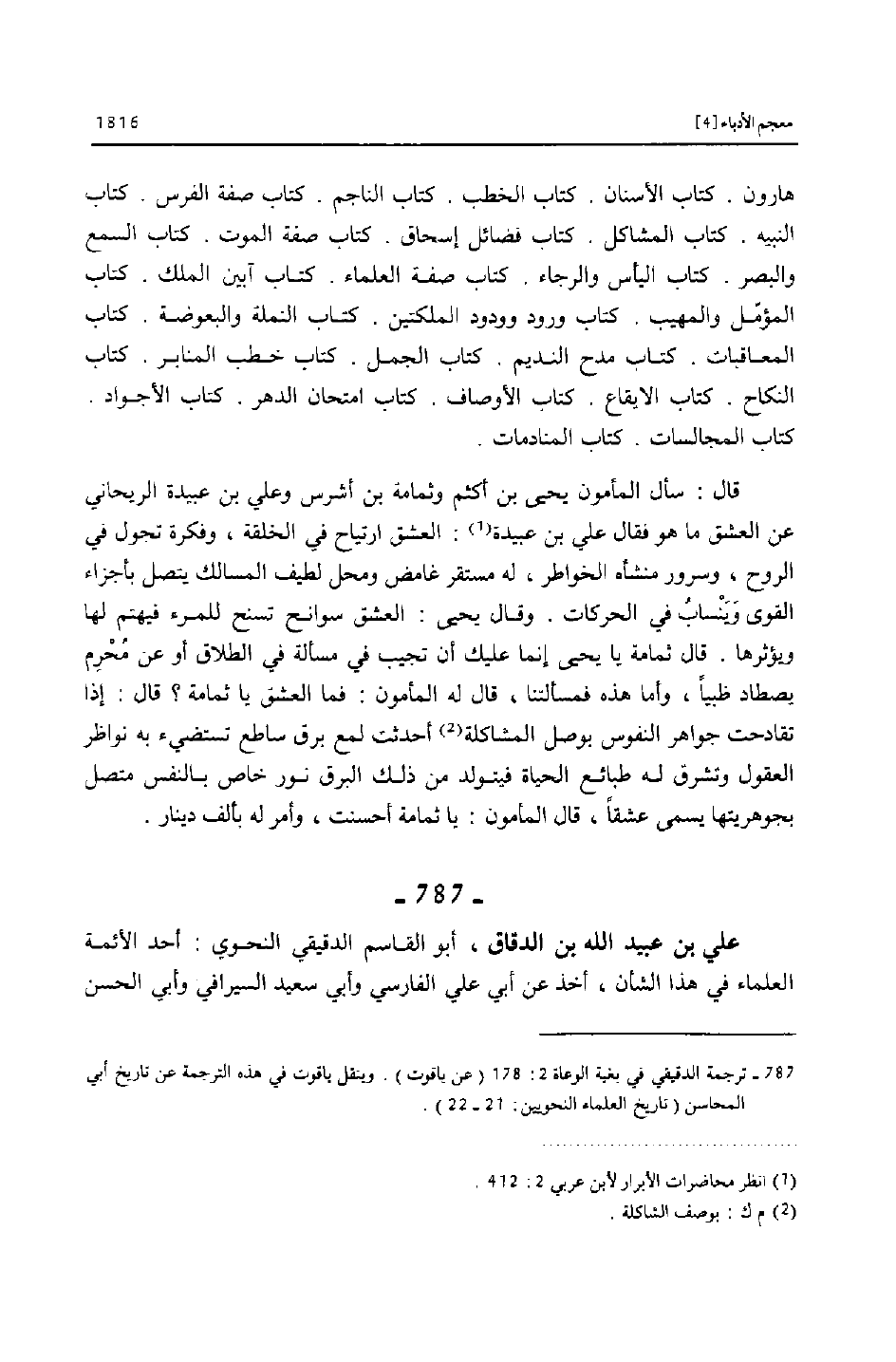 [787]- ترجمة الدقيقي في بغية الوعاة 2: 178 (عن ياقوت) . وينقل ياقوت في هذه الترجمة عن تاريخ أبي المحاسن (تاريخ العلماء النحويين: 21- 22) .
