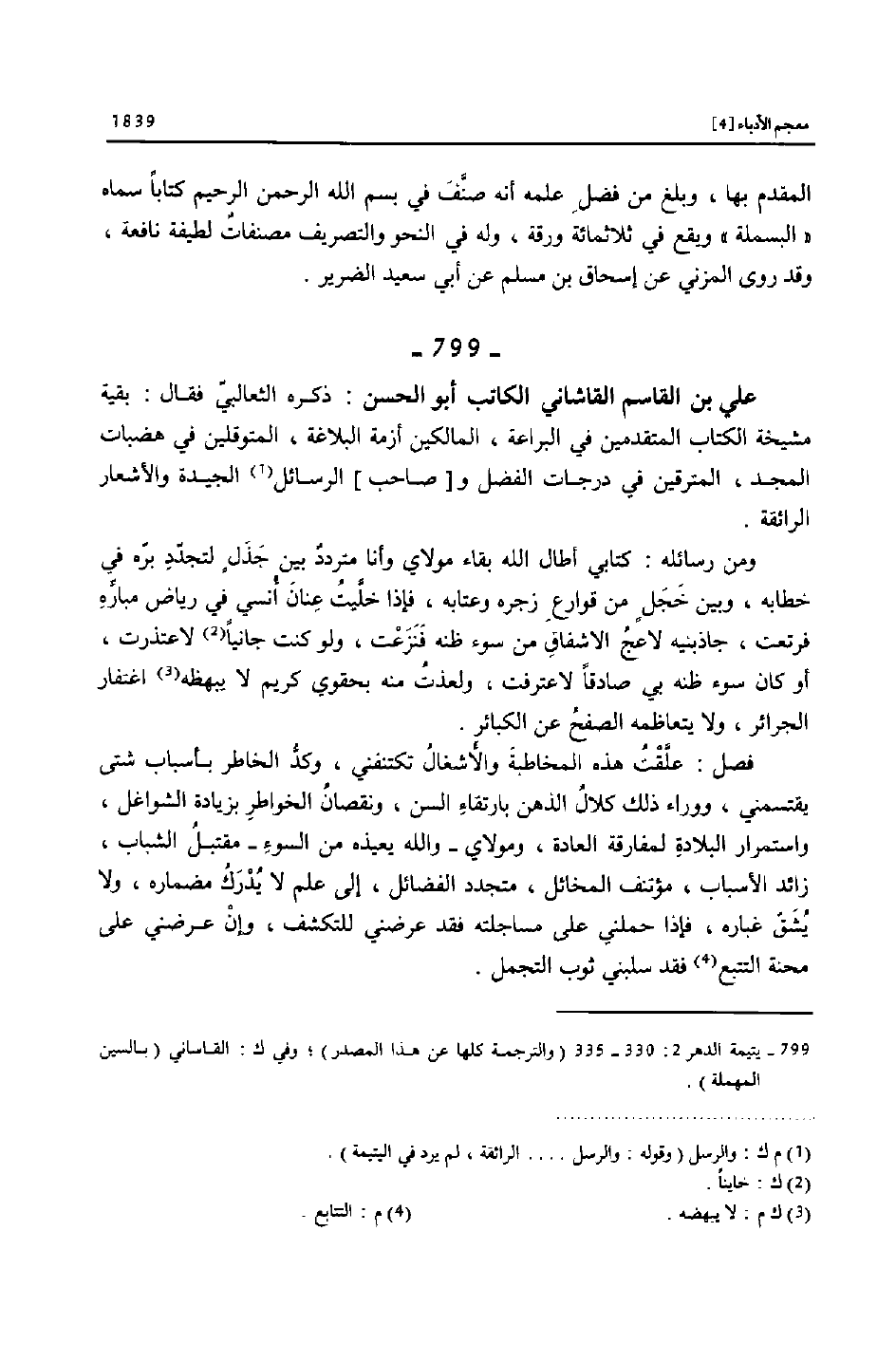 [799]- يتيمة الدهر 2: 330- 335 (والترجمة كلها عن هذا المصدر) ؛ وفي ك: القاساني (بالسين المهملة) .