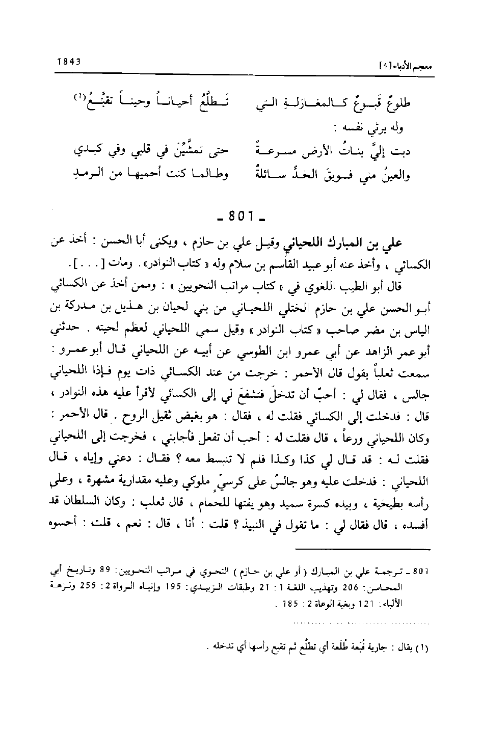 [801]- ترجمة علي بن المبارك (أو علي بن حازم) النحوي في مراتب النحويين: 89 وتاريخ أبي المحاسن: 206 وتهذيب اللغة 1: 21 وطبقات الزبيدي: 195 وإنباه الرواة 2: 255 ونزهة الألباء: 121 وبغية الوعاة 2: 185.