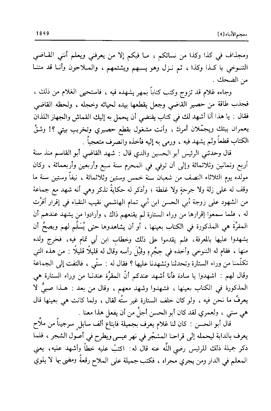 قال وحدثني الرئيس أبو الحسين والدي قال: شهد القاضي أبو القاسم منذ سنة أربع وثمانين وثلاثمائة وإلى أن توفي في المحرم سنة سبع وأربعين وأربعمائة، وكان مولده يوم الثلاثاء النصف من شعبان سنة خمس وستين وثلاثمائة، نيفا وستين سنة ما وقف له على زلة ولا جرحة ولا غلطة؛ وأذكر له حكاية تذكر وهي أنه شهد مع جماعة من الشهود على زوجة أبي الحسن ابن أبي تمام الهاشمي نقيب النقباء في إقرار أقرّت له، فلما سمعوا إقرارها من وراء الستارة لم يقنعهم ذاك، وأرادوا من يشهد عندهم أن المقرّة هي المذكورة في الكتاب بعينها، أو أن يشاهدوها حتى يسلّم لهم ويصحّ أن يشهدوا عليها بالمعرفة، فلم يقدموا على ذلك وخطاب ابن أبي تمام فيه، فخرج ولده منها، فقام له التنوخي وأخذه في حجره وقبّل رأسه وقال له قليلا قليلا: من هذه التي تكلّمنا من وراء الستارة وتحدثنا وتشهدنا عليها؟ فقال له: ستّي، فالتفت إلى الجماعة وقال لهم: اشهدوا يا سادة فأنا أشهد عندكم أنّ المقرّة عندنا من وراء الستارة هي المذكورة في الكتاب بعينها، فشهدوا وشهد معهم، وقال من بعد: هذا صبيّ لا يعرف ما نحن فيه، ولو كان خلف الستارة غير ستّه لقال، ولما كانت هي بعينها قال هي ستي، ولعمري لقد كان أبو الحسن أجلّ من أن يفعل هذا معنا.