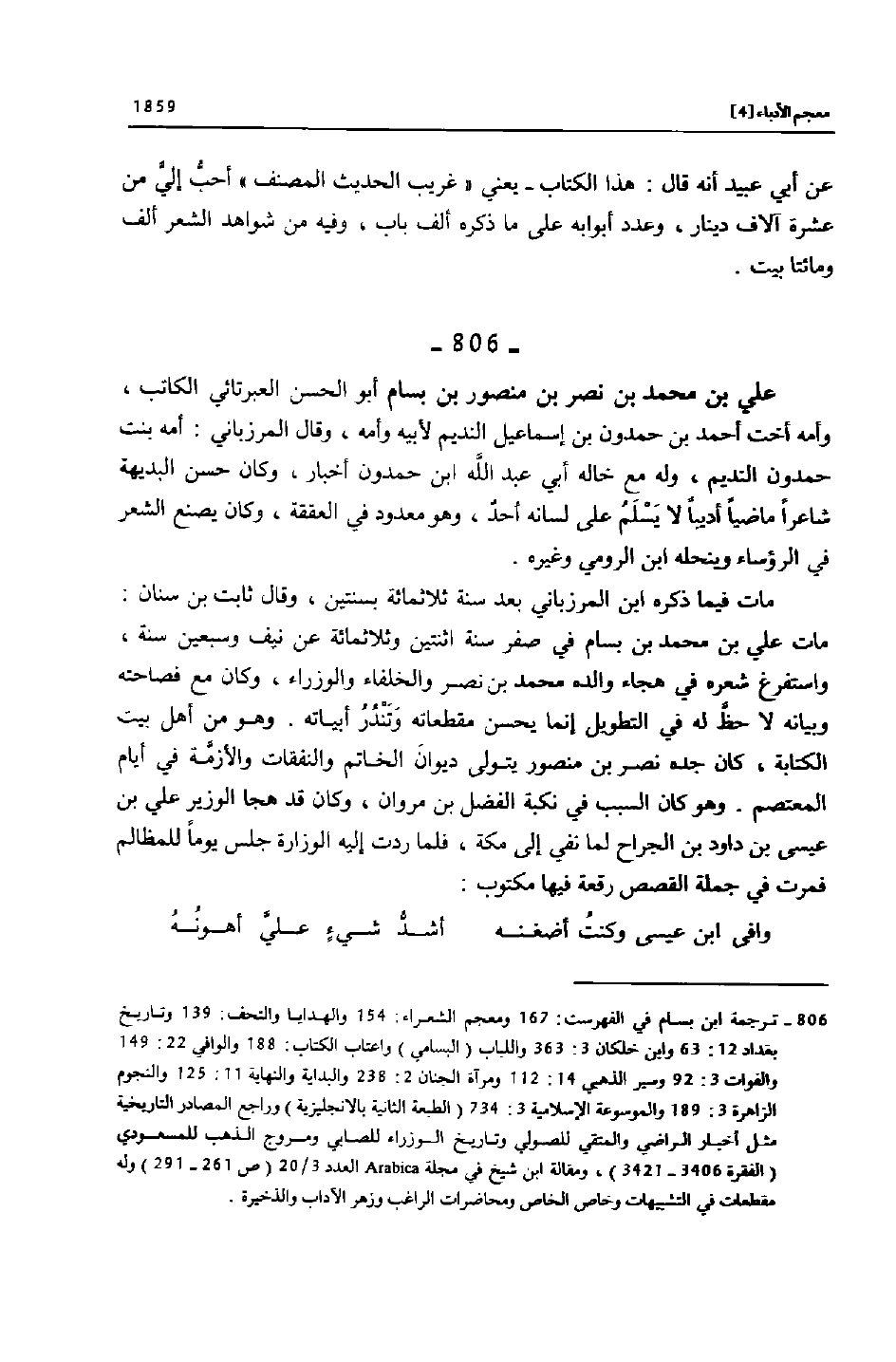 [806]- ترجمة ابن بسام في الفهرست: 167 ومعجم الشعراء: 154 والهدايا والتحف: 139 وتاريخ بغداد 12: 63 وابن خلكان 3: 363 واللباب (البسامي) واعتاب الكتاب: 188 والوافي 22: 149 والفوات 3: 92 وسير الذهبي 14: 112 ومرآة الجنان 2: 238 والبداية والنهاية 11: 125 والنجوم الزاهرة 3: 189 والموسوعة الإسلامية 3: 734 (الطبعة الثانية بالانجليزية) وراجع المصادر التاريخية مثل أخبار الراضي والمتقي للصولي وتاريخ الوزراء للصابي ومروج الذهب للمسعودي (الفقرة 3406- 3421) ، ومقالة ابن شيخ في مجلة Arbica العدد 3/20 (ص 261- 291) وله مقطعات في التشبيهات وخاص الخاص ومحاضرات الراغب وزهر الآداب والذخيرة.