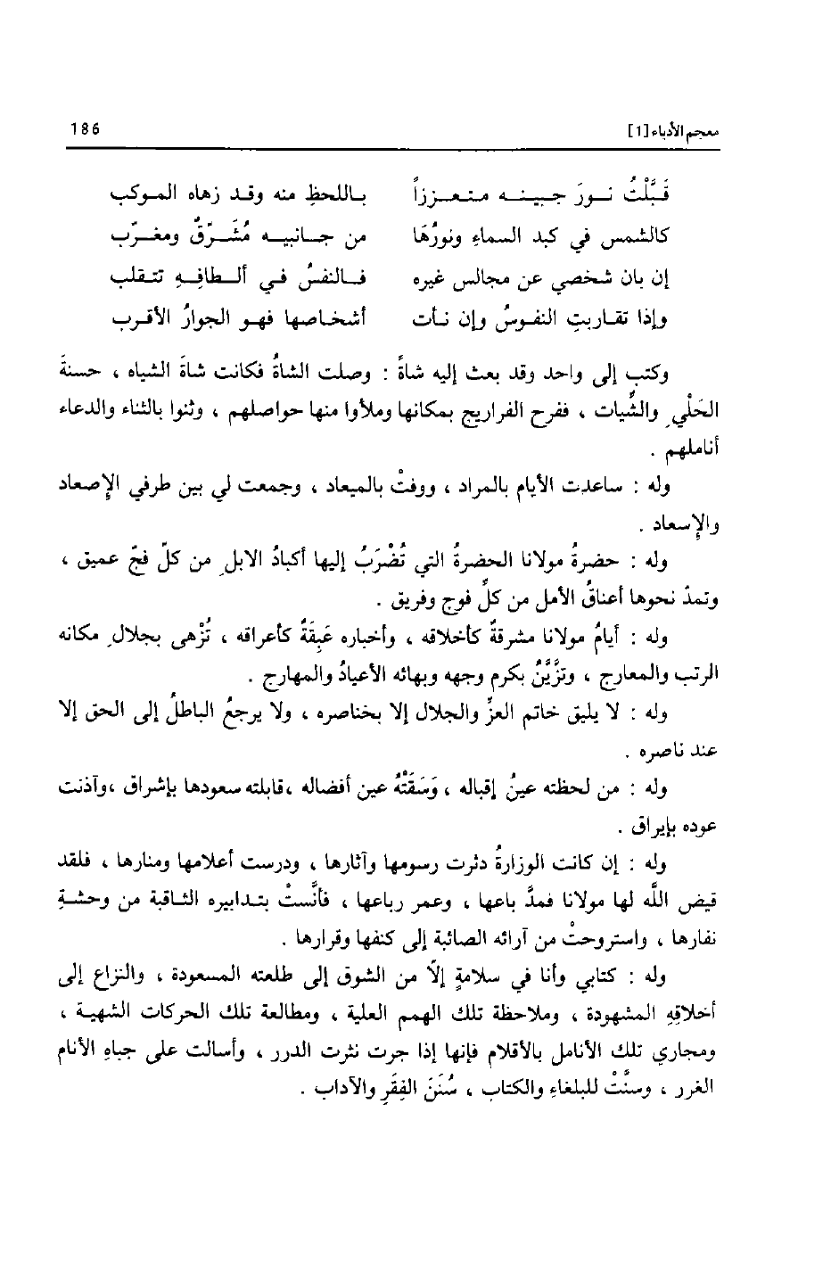 وله: حضرة مولانا الحضرة التي تضرب إليها أكباد الابل من كلّ فجّ عميق، وتمدّ نحوها أعناق الأمل من كلّ فوج وفريق.