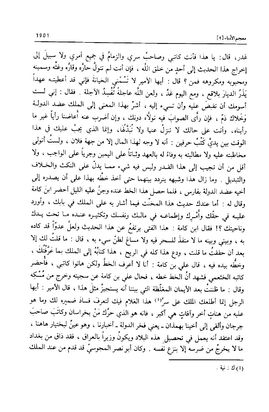 غدر، قال: يا هذا فأنت كاتبي وصاحب سري والزمام في جمع أمري ولا سبيل إلى إخراج هذا الحديث إلى أحد من خلق الله، فإن أنت لم تتولّ حارّه وقارّه وغثّه وسمينه ومحبوبه ومكروهه فمن؟ قال: أيها الأمير لا تسمني الخيانة فإني قد أعطيته عهدا يذر الديار بلاقع، ومع اليوم غد، ولعن الله عاجلة تفسد الآجلة. فقال: إني لست أسومك أن تقبض عليه وأن تسيء إليه، أشر بهذا المعنى إلى الملك عضد الدولة وخلاك ذمّ، فإن رأى الصواب فيه تولّاه دونك، وإن أضرب عنه أعاضنا رأيا غير ما رأيناه، وأنت على حالك لا تنزل عنها ولا تبدّلها، وإنما الذي يجب عليك في هذا الوقت بين يديّ كتب حرفين: أنه لا وجه لهذا المال إلا من جهة فلان، ولست أتولى مخاطبته عليه ولا مطالبته به وفاء له بالعهد وثباتا على اليمين وجريا على الواجب، ولا أقل من أن تجيب إلى هذا القدر وليس فيه شيء مما يدلّ على النكث والخلاف والتبديل. وما زال هذا وشبهه يتردد بينهما حتى أخذ خطّه بهذا على أن يصدره إلى أخيه عضد الدولة بفارس، فلما حصل هذا الخط عنده وجنّ عليه الليل أحضر ابن كامة وقال له: أما عندك حديث هذا المخنّث فيما أشار به على الملك في بابك، وأورد عليه في حقّك وأمرك وإطماعه في مالك ونفسك وتكثيره عنده ما تحت يدك وناحيتك؟! فقال ابن كامة: هذا الفتى يرتفع عن هذا الحديث ولعلّ عدوّا قد كاده به، وبيني وبينه ما لا منفذ للسحر فيه ولا مساغ لظنّ سيء به، قال: ما قلت لك إلا بعد أن حققت ما قلت، ودع هذا كله في الريح، هذا كتابه إلى الملك بما عرّفتك، وخطّه بيده فيه، قال علي بن كامة: أنا لا أعرف الخطّ ولكن هاتوا كاتبي، فأحضر كاتبه الخثعمي فشهد أنّ الخط خطه، فحال علي بن كامة عن سجيته وخرج من مسكه وقال: ما ظننت بعد الأيمان المغلّظة التي بيننا أنه يستجيز مثل هذا، قال الأمير: أيها الرجل إنما أطلعك الملك على سرّ «1» هذا الغلام فيك لتعرف فساد ضميره لك وما هو عليه من هنات أخر وآفات هي أكبر، فانه هو الذي حرّك من بخراسان وكاتب صاحب جرجان وألقى إلى أخينا بهمذان- يعني فخر الدولة- أخبارنا، وهو عين لبختيار هاهنا، وقد اعتقد أنه يعمل في تحصيل هذه البلاد ويكون وزيرا بالعراق، فقد ذاق من بغداد ما لا يخرج من ضرسه إلا بنزع نفسه. وكان أبو نصر المجوسيّ قد قدم من عند الملك