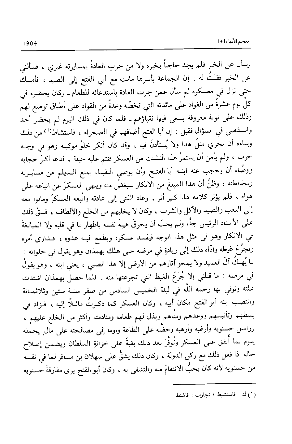 وسأل عن الخبر فلم يجد حاجبا يخبره ولا من جرت العادة بمسايرته غيري، فسألني عن الخبر فقلت له: إن الجماعة بأسرها مالت مع أبي الفتح إلى الصيد، فأمسك حتى نزل في معسكره ثم سأل عمن جرت العادة باستدعائه للطعام- وكان يحضره في كلّ يوم عشرة من القواد على مائدته التي تخصّه وعدة من القواد على أطباق توضع لهم وذلك على نوبة معروفة يسعى فيها نقباؤهم- فلما كان في ذلك اليوم لم يحضر أحد واستقصى في السؤال فقيل: إن أبا الفتح أضافهم في الصحراء، فاستشاط «1» من ذلك وساءه أن يجري مثل هذا ولا يستأذن فيه، وقد كان أنكر خلوّ موكبه وهو في وجه حرب، ولم يأمن أن يستمرّ هذا التشتت من العسكر فتتم عليه حيلة، فدعا أكبر حجابه ووصّاه أن يحجب عنه ابنه أبا الفتح وأن يوصي النقباء بمنع الديلم من مسايرته ومخالطته، وظنّ أن هذا المبلغ من الانكار سيغضّ منه وينهى العسكر عن اتباعه على هواه، فلم يؤثر كلامه هذا كبير أثر، وعاد الفتى إلى عادته واتّبعه العسكر ومالوا معه إلى اللعب والصيد والأكل والشرب، وكان لا يخليهم من الخلع والألطاف، فشقّ ذلك على الأستاذ الرئيس جدّا ولم يحبّ أن يخرق هيبة نفسه باظهار ما في قلبه ولا المبالغة في الانكار وهو في مثل هذا الوجه فيفسد عسكره ويطمع فيه عدوه، فدارى أمره وتجرّع غيظه وأدّاه ذلك إلى زيادة في مرضه حتى هلك بهمذان وهو يقول في خلواته:
