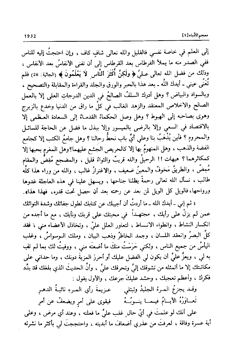 (الجاثية: 26) فلم تعنّى عيني- أيدك الله- بعد هذا بالحبر والورق والجلد والقراءة والمقابلة والتصحيح، وبالسواد والبياض؟ وهل أدرك السلف الصالح في الدين الدرجات العلى إلا بالعمل الصالح والاخلاص المعتقد والزهد الغالب في كلّ ما راق من الدنيا وخدع بالزبرج وهوى بصاحبه إلى الهبوط؟ وهل وصل الحكماء القدماء إلى السعادة العظمى إلا بالاقتصاد في السعي وإلا بالرضى بالميسور وإلا ببذل ما فضل عن الحاجة للسائل والمحروم؟ فأين يذهب بنا وعلي أيّ باب نحطّ رحالنا؟ وهل جامع الكتب إلا كجامع الفضة والذهب، وهل المنهوم بها إلا كالحريص الجشع عليهما؟ وهل المغرم بحبها إلا كمكاثرهما؟ هيهات!! الرحيل والله قريب والثواء قليل، والمضجع مقض والمقام ممضّ، والطريق مخوف والمعين ضعيف، والاغترار غالب، والله من وراء هذا كلّه طالب، نسأل الله تعالى رحمة يظلنا جناحها، ويسهل علينا في هذه العاجلة غدوها ورواحها، فالويل كل الويل لمن بعد عن رحمته بعد أن حصل تحت قدره، فهذا هذا» .