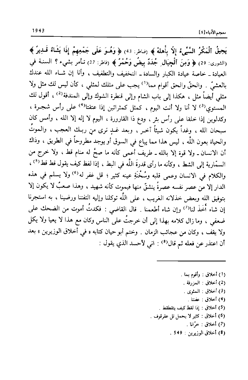 (فاطر: 27) تأمر بشيء؟ السنة في العيادة- خاصة عيادة الكبار والسادة- التخفيف والتطفيف، وأنا إن شاء الله عندك بالعشيّ. والحقّ والحق أقوام مما «1» يجب على مثلك لمثلي، كأن ليس لك مثل ولا مثلي أيضا مثل، هكذا إلى باب الشام وإلى قنطرة الشوك وإلى المندفة «2» ، أقول لك المستوي «3» لا أنا ولا أنت اليوم، كمثل كمثراتين إذا عتقتا «4» على رأس شجرة، وكدلوين إذا خلقا على رأس بئر، ودع ذا القارورة، اليوم لا إله إلا الله، وأمس كان سبحان الله، وغدا يكون شيئا آخر، وبعد غد ترى من ربك العجب، والموت والحياة بعون الله، ليس هذا مما يباع في السوق أو يوجد مطروحا في الطريق، وذاك أن الانسان- ولا قوة إلا بالله- طريف أعمى كأنه ما صحّ له منام قط، ولا خرج من السمّارية إلى الشط، وكأنه ما رأى قدرة الله في البط، إذا لفظ كيف يقول قط قط «5» ، والكلام في الانسان وعمى قلبه وسخنة عينه كثير؛ قل غفر له «6» ولا يسلم في هذه الدار إلا من عصر نفسه عصرة ينشقّ منها فيموت كأنه شهيد، وهذا صعب لا يكون إلا بتوفيق الله وبعض خذلانه الغريب، على الله توكلنا وإليه التفتنا ورضينا، به استجرنا إن شاء أخذ لنا «7» وإن شاء أطعمنا. قال القاضي: فكدت أموت من الضحك على ضعفي، وما زال كلامه بهذا إلى أن خرجت على الناس وكان مع هذا لا يعيا ولا يكل ولا يقف، وكان من عجائب الزمان. وختم أبو حيان كتابه «في أخلاق الوزيرين» بعد أن اعتذر عن فعله ثم قال «8» : اني لأحسد الذي يقول: