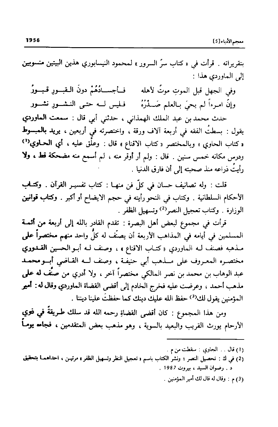 بتقريراته. قرأت في «كتاب سرّ السرور» لمحمود النيسابوري هذين البيتين منسوبين إلى الماوردي هذا: