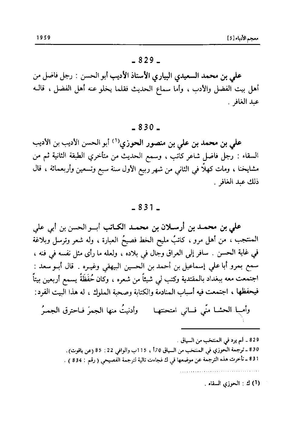 (830) - ترجمة الحوزي في المنتخب من السياق 70 أ، 115 ب والوافي 22: 85 (عن ياقوت) .