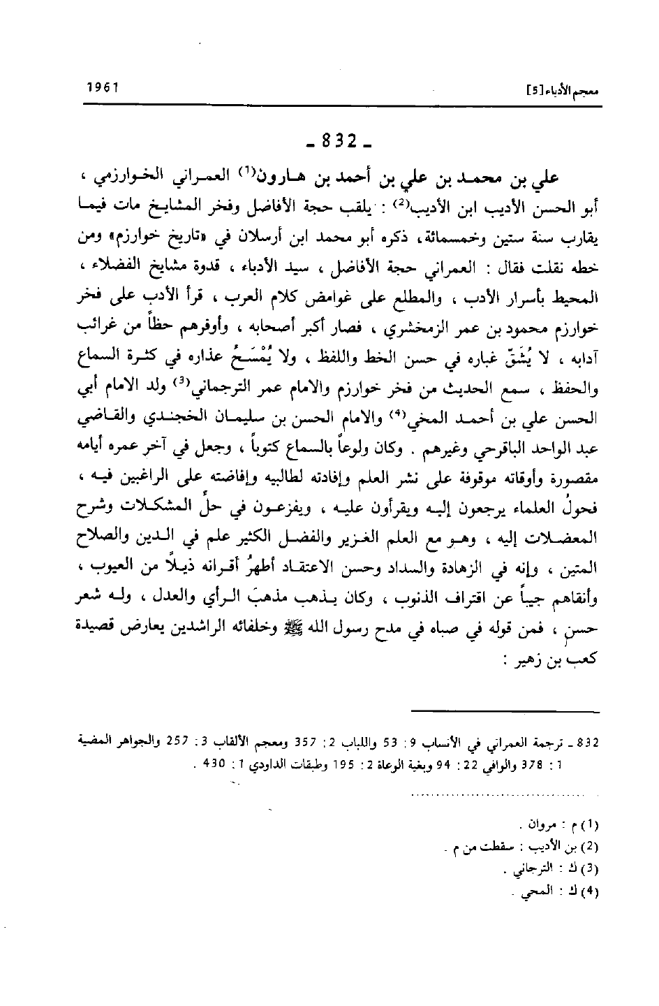 (832) - ترجمة العمراني في الأنساب 9: 53 واللباب 2: 357 ومعجم الألقاب 3: 257 والجواهر المضية 1: 378 والوافي 22: 94 وبغية الوعاة 2: 195 وطبقات الداودي 1: 430.