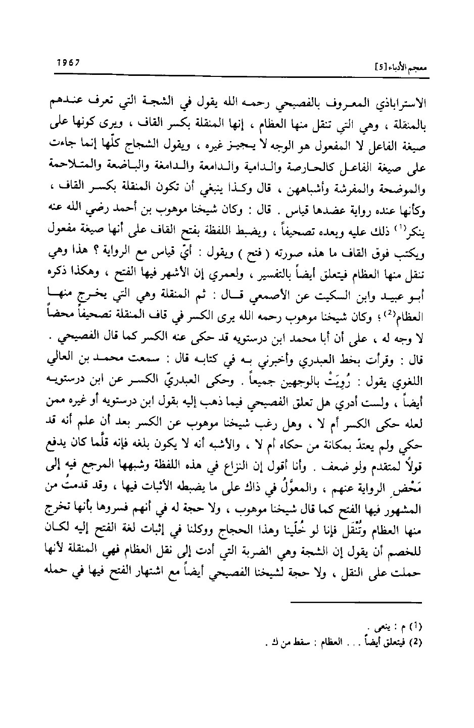 الاستراباذي المعروف بالفصيحي رحمه الله يقول في الشجة التي تعرف عندهم بالمنقلة، وهي التي تنقل منها العظام، إنها المنقلة بكسر القاف، ويرى كونها على صيغة الفاعل لا المفعول هو الوجه لا يجيز غيره، ويقول الشجاج كلّها إنما جاءت على صيغة الفاعل كالحارصة والدامية والدامعة والدامغة والباضعة والمتلاحمة والموضحة والمفرشة وأشباههن، قال وكذا ينبغي أن تكون المنقلة بكسر القاف، وكأنها عنده رواية عضدها قياس. قال: وكان شيخنا موهوب بن أحمد رضي الله عنه ينكر «1» ذلك عليه ويعده تصحيفا، ويضبط اللفظة بفتح القاف على أنها صيغة مفعول ويكتب فوق القاف ما هذه صورته (فتح) ويقول: أيّ قياس مع الرواية؟ هذا وهي تنقل منها العظام فيتعلق أيضا بالتفسير، ولعمري إن الأشهر فيها الفتح، وهكذا ذكره أبو عبيد وابن السكيت عن الأصمعي قال: ثم المنقلة وهي التي يخرج منها العظام «2» ؛ وكان شيخنا موهوب رحمه الله يرى الكسر في قاف المنقلة تصحيفا محضا لا وجه له، على أن أبا محمد ابن درستويه قد حكى عنه الكسر كما قال الفصيحي.
